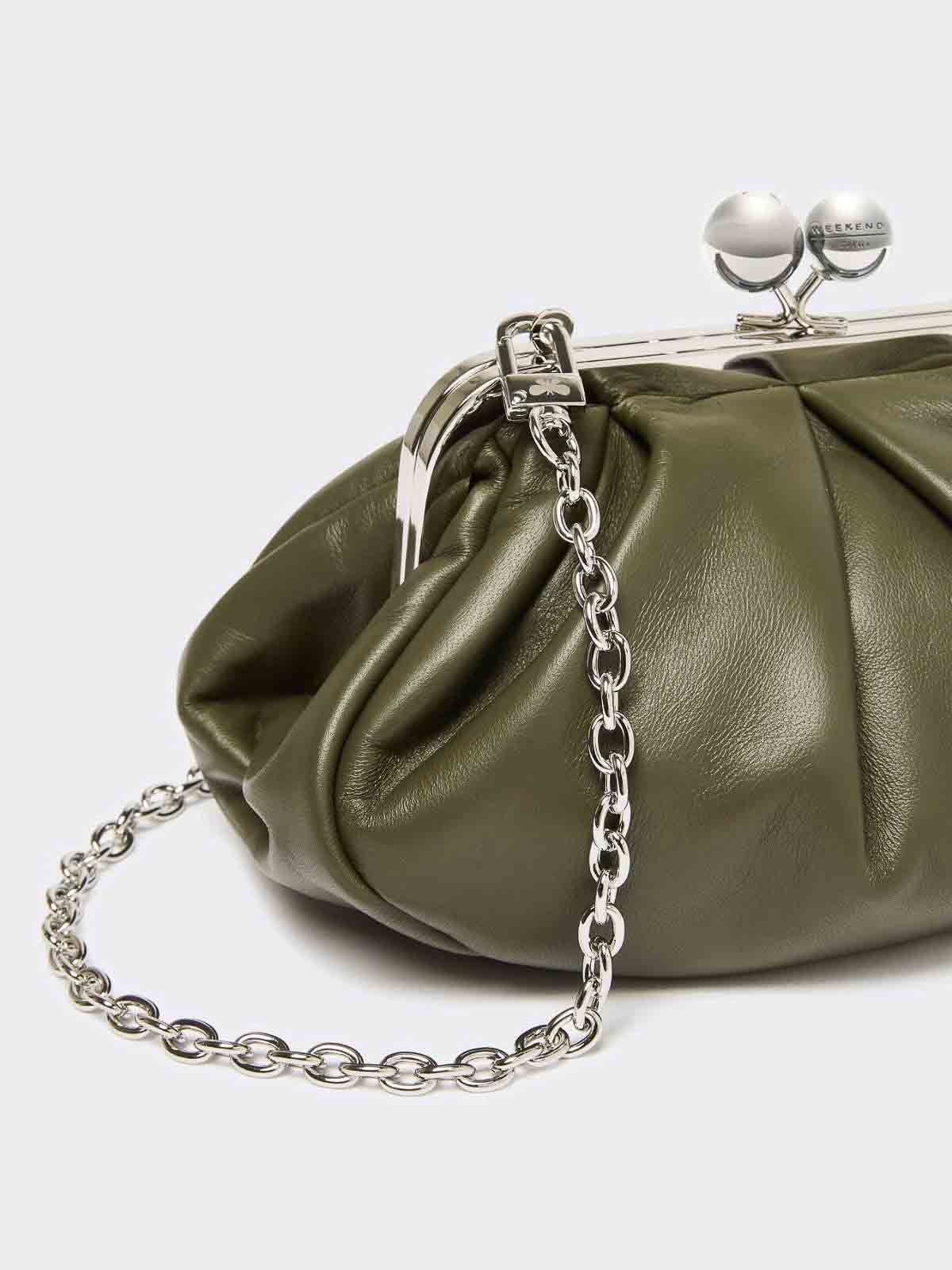Prati ペストリーバッグ柔らかな光沢仕上げのスモールクラッチバッグ。チェーンストラップとショルダーストラップが付いており、隠れたスラットに取り付けることができ、ショルダーやクロスボディバッグとして簡単に持ち運べます