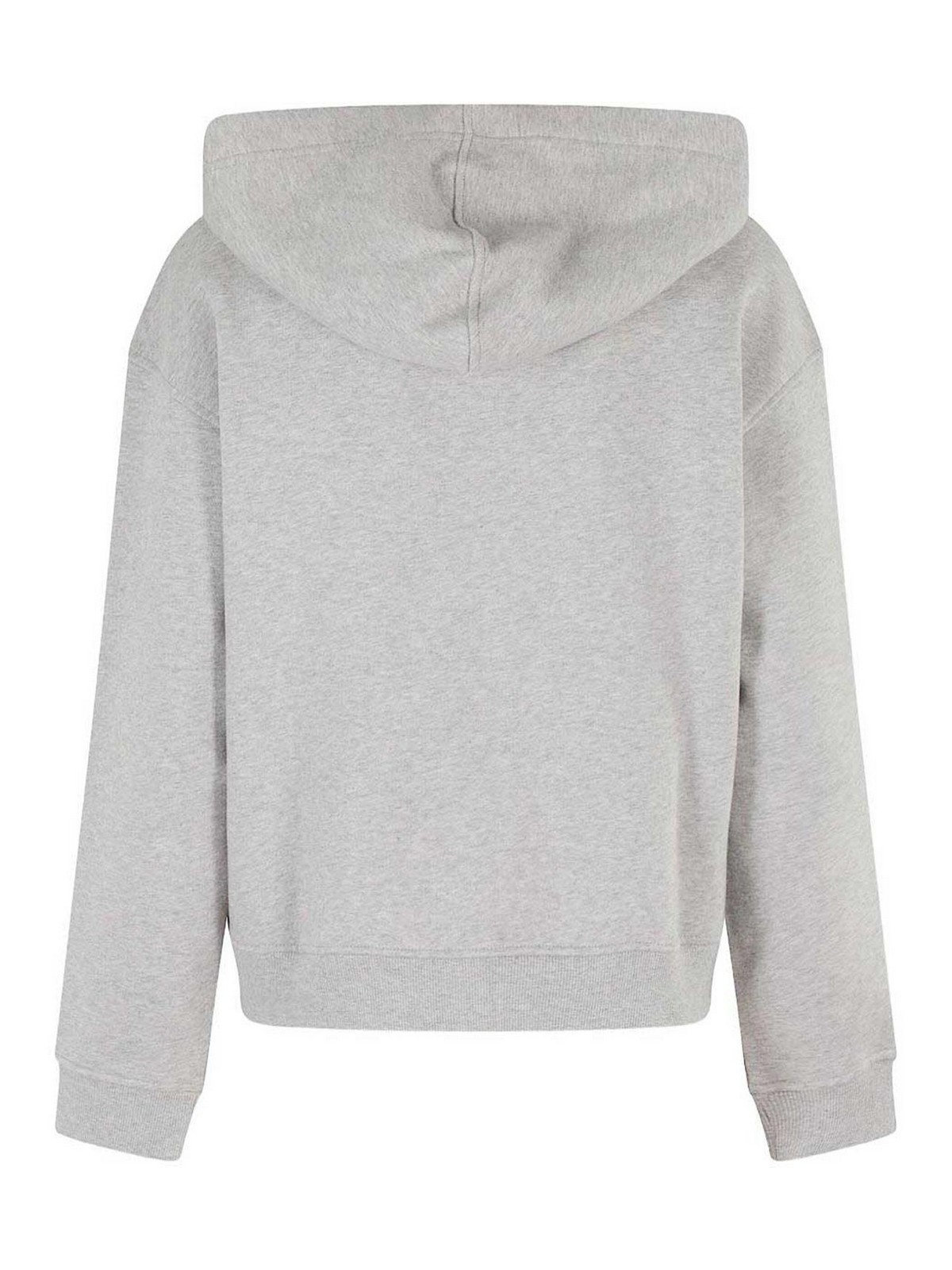 グレーのコットンジャージースウェットシャツ。レギュラーフィットのロングスリーブ、ドロップショルダーのフロントファスナー付きフロントジッパー付きカンガルーポケット、リブ編みの袖口と裾にロゴ刺繍入り