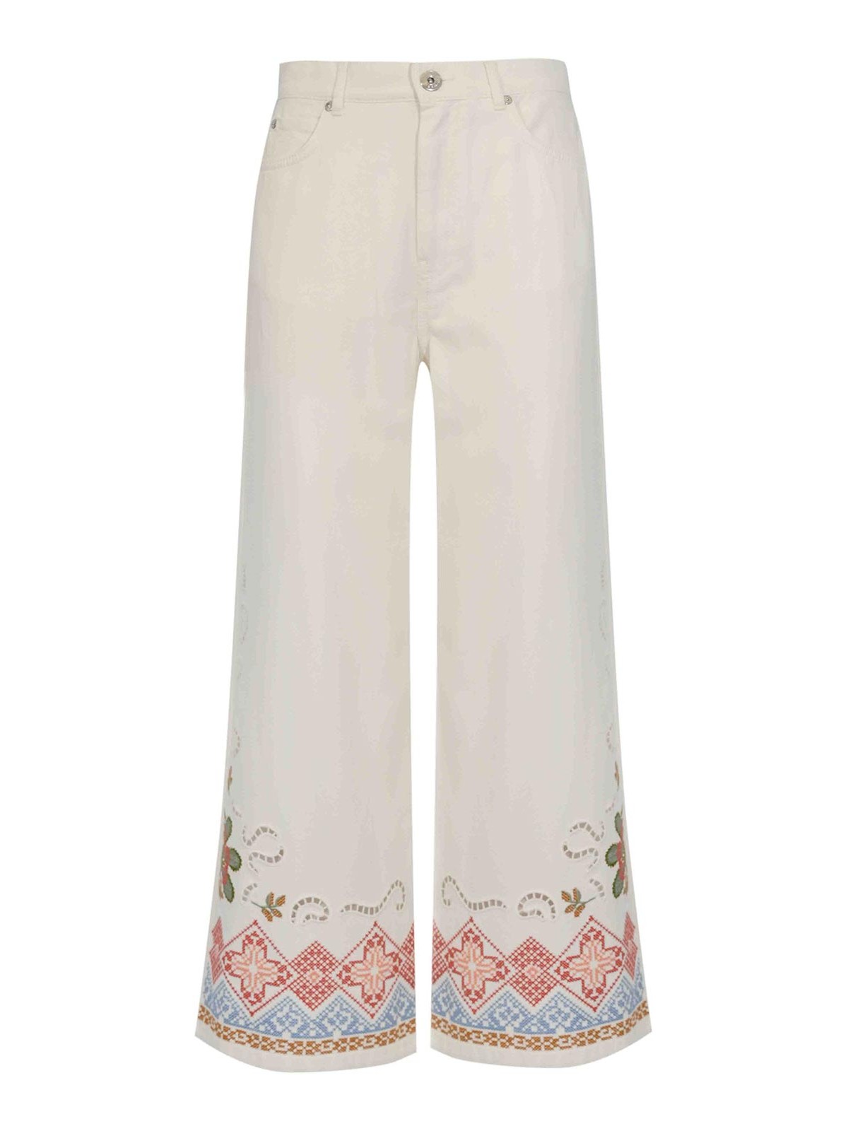 女性用コットンブルパンツ、ウィークエンドマックスマーラ、WKDADUNCOモデル、生地:コットンブル、柄:ソリッドカラー、ボトムに装飾刺繍、ウエスト:ベルトループ付きレギュラー、クロージャー:ジッパーとボタン、ポケット:前面にアメリカ製で後ろに付属、長さ:足首までの長さ、ディテール:脚の底にマルチカラーの刺繍とミシン目、裏地:いいえ、フィット:ワイドでストレートレッグ