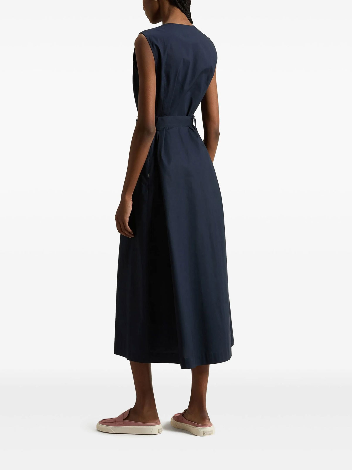 Vネックラインとシルエットを際立たせるバックルベルトが特徴の、ミッドシーズンにぴったりのエレガントで用途の広い服であるポプリンディピューロのシュレッドドレスは、シルエットを際立たせる繊細な折り目がスカートに施され、シンプルで洗練されたデザインです。