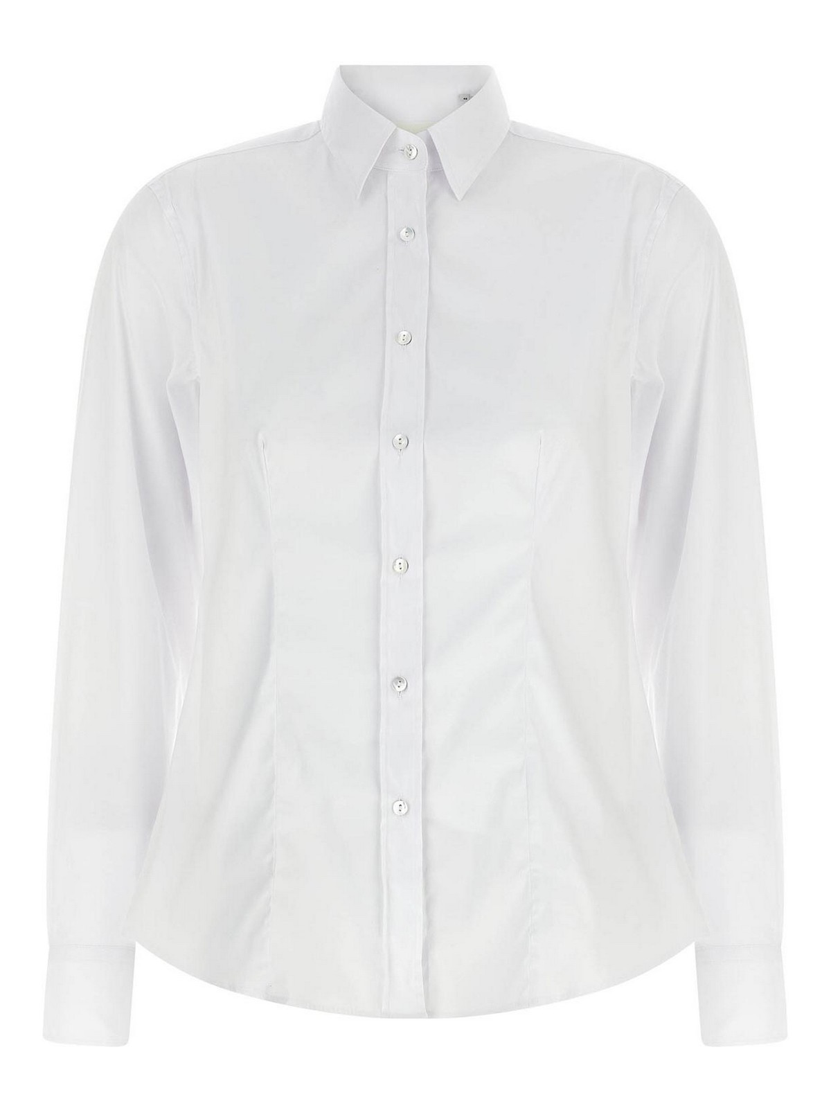 クラシックな「サラ」コットン混紡シャツ。先のとがった襟、前後にプリーツをあしらったややフレア、前面にボタン留め、袖口とボタンが付いた長袖。