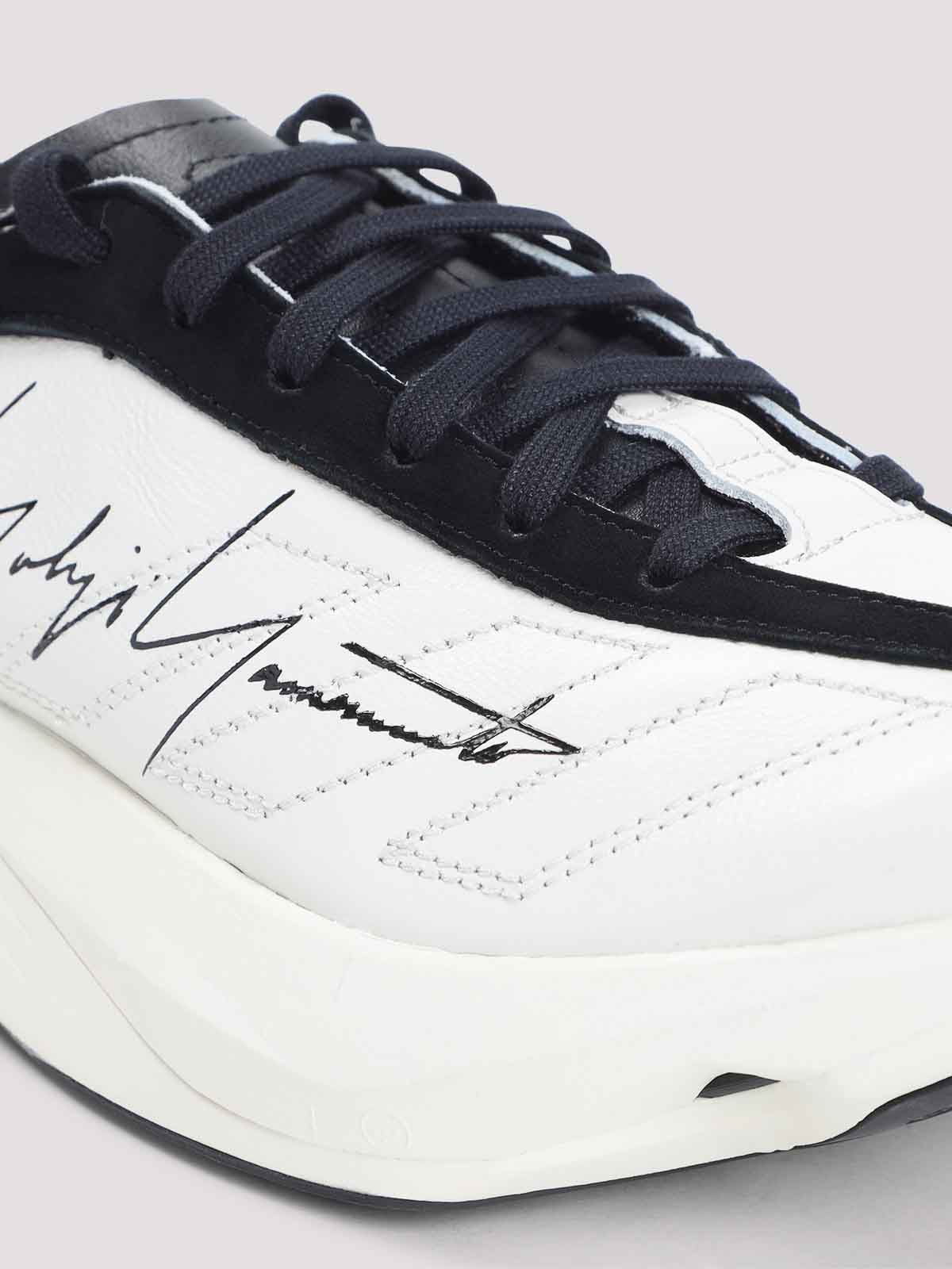 Y adios pro lx グレースニーカーはライトグレーとブラックのアーモンドトゥレース製で、タンにはアップエンボス加工のロゴ、サイドには黒のyohji yamamotoシグネチャーのコントラストが効いたブラックのテキスタイルでデザインが足りなくなっています