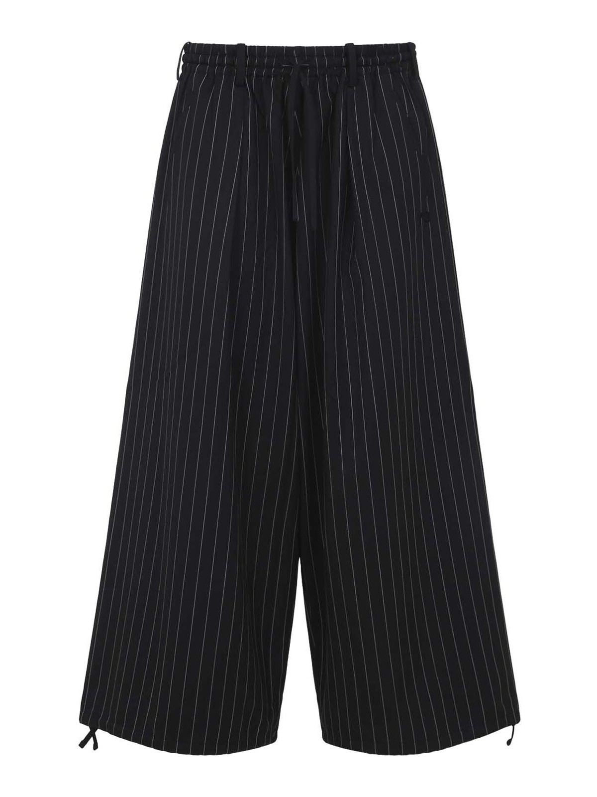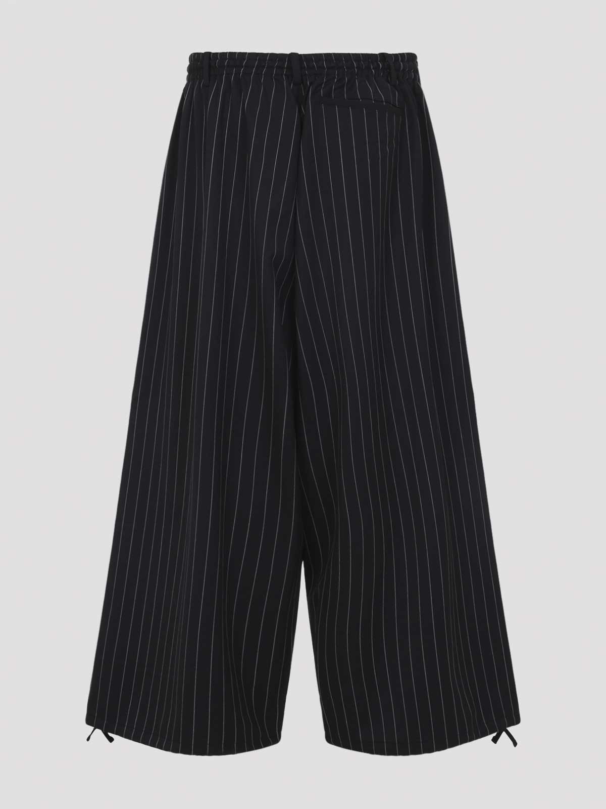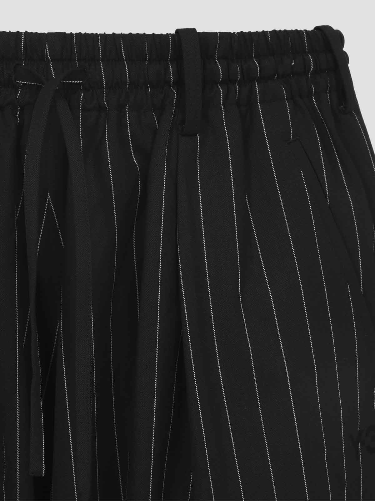 Y-3 ブラックロウカーウールパンツ。ポリエステル、ウール、エラステインのブレンドで作られています。伸縮性のあるウエスト、フロントに同系色のドローストリングのディテール、ベルトループ、サイドポケット、バックスリットポケット、ワイドレッグ、同系色のストラップが付いたストレートヘム。黒地にチョークパールのピンストライプデザイン。
