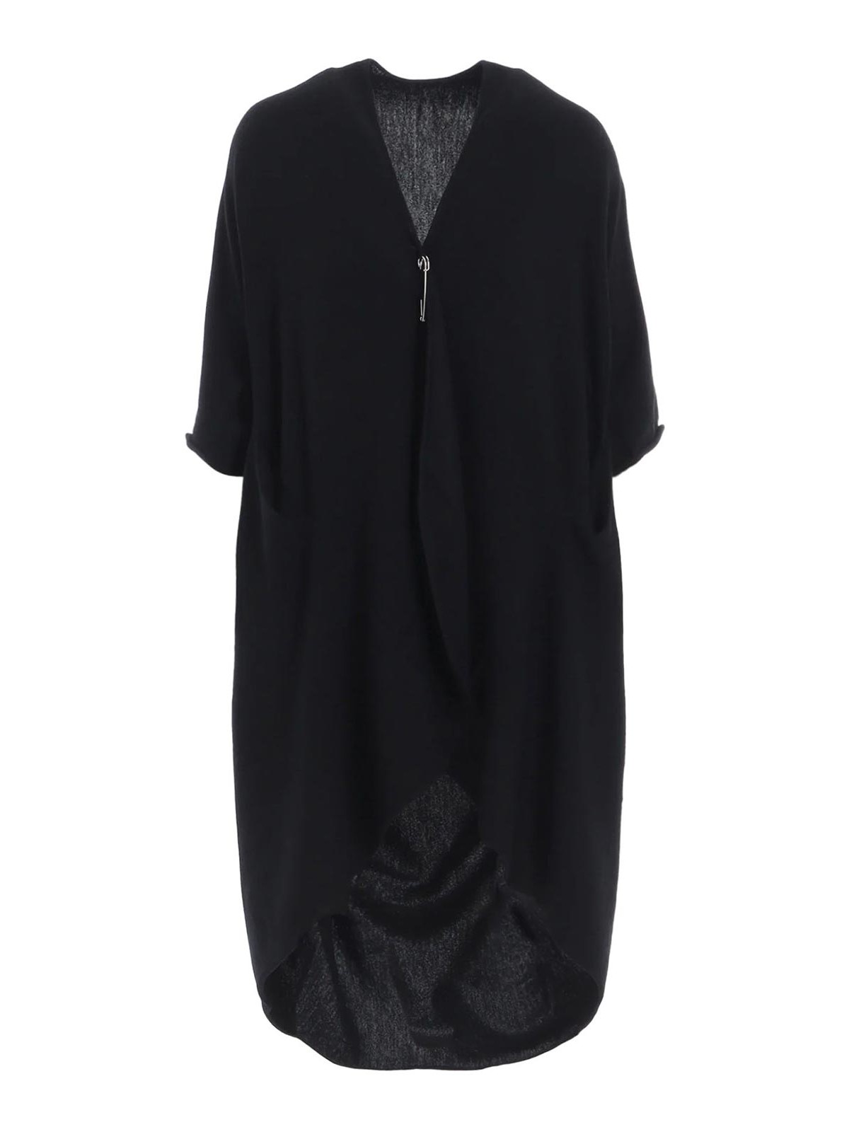 ブラックウールのロングショールセーター、内側にサイドポケット、ドロップスリーブ。