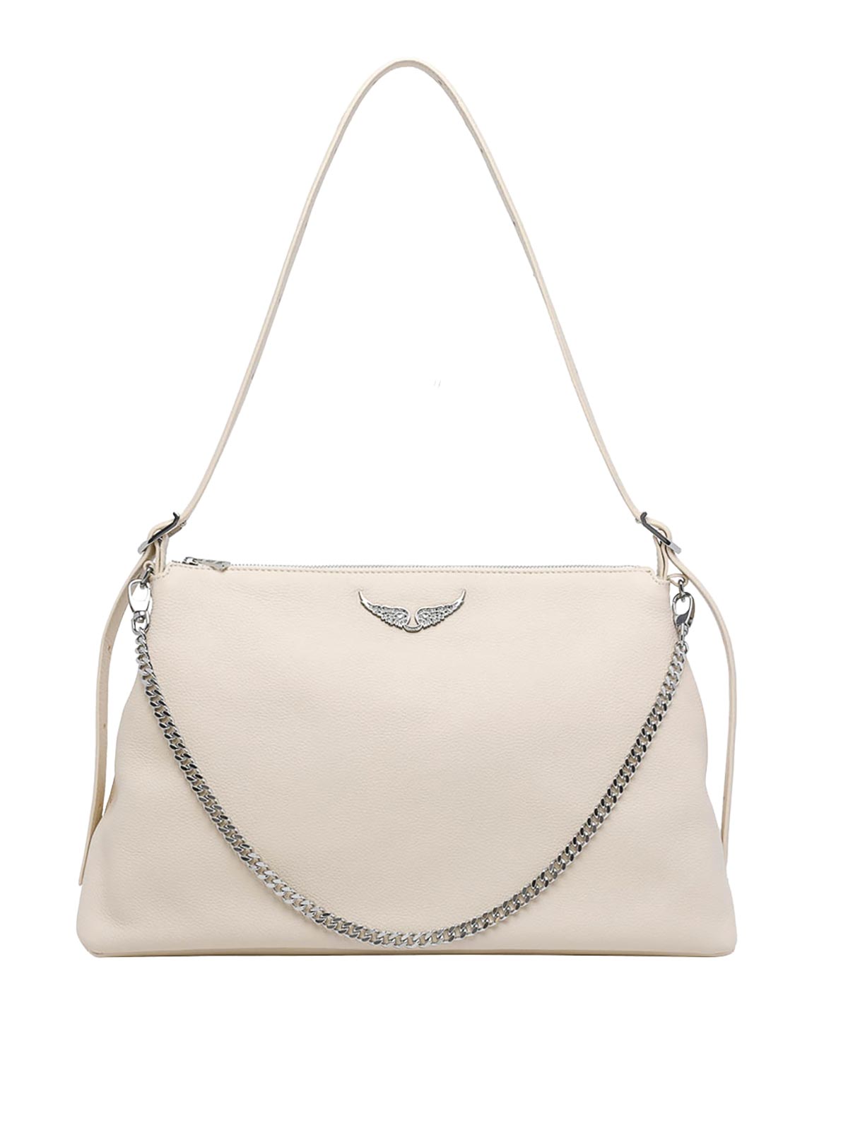 Zadig & Voltaire アイボリージムショルダーバッグ、ファスナー開閉、内側にオープンポケット、取り外し可能なチェーンストラップ、正面ロゴ