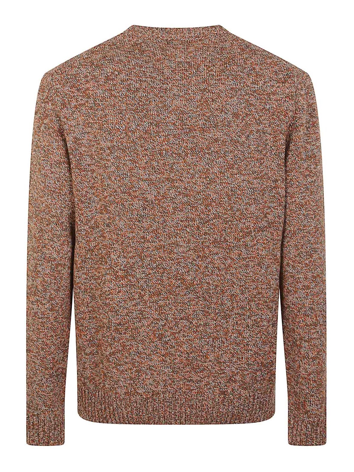 オリーブオレンジメランジのウールセーター、リブ編みの裾と袖口が付いたクルーネック。