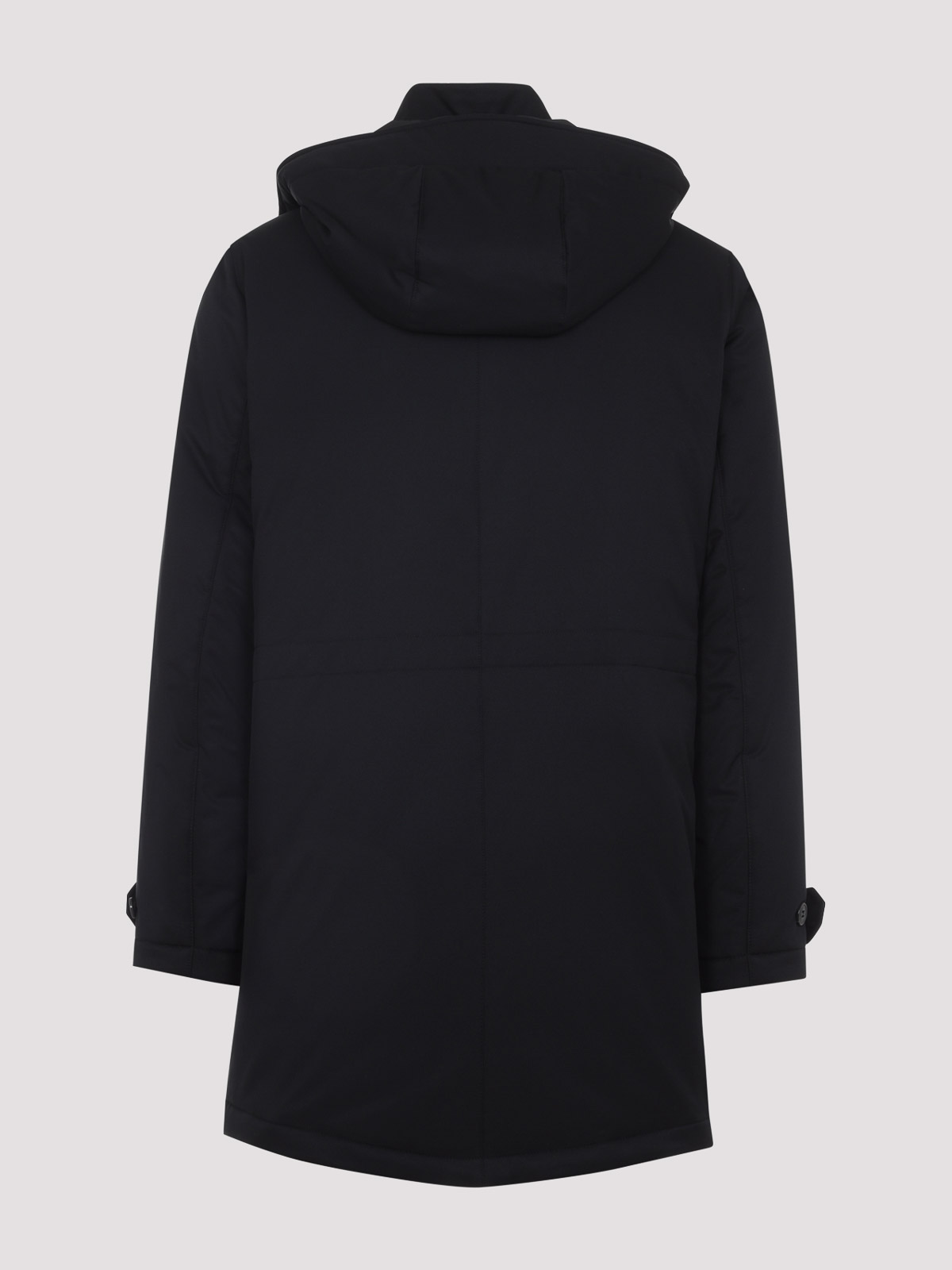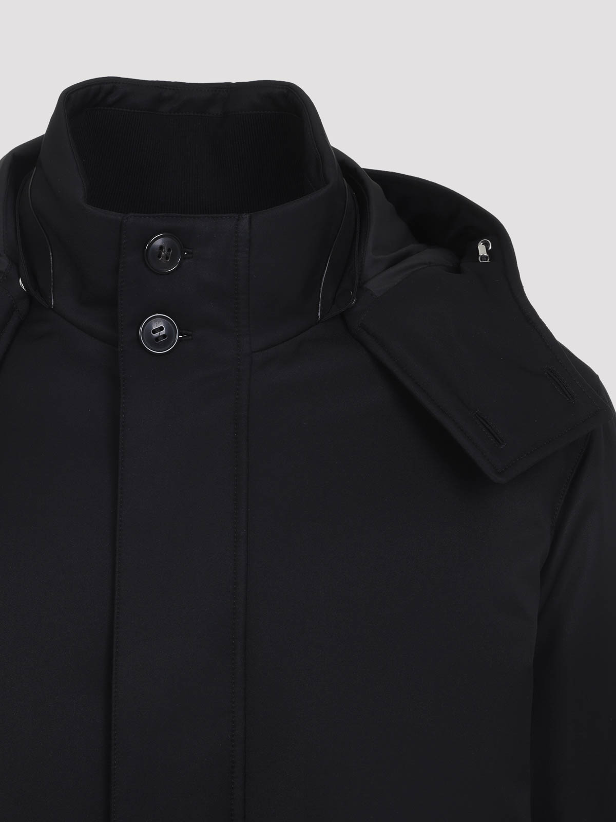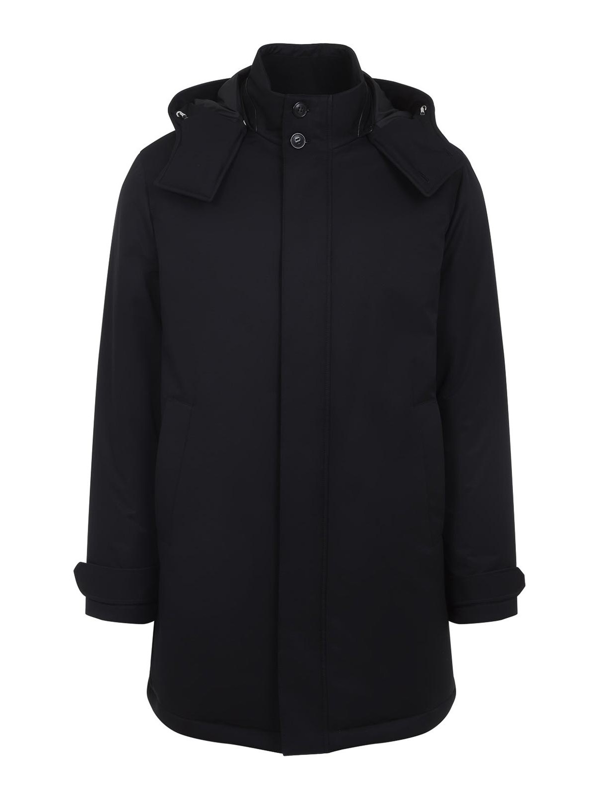 Zegna マイクロファイバーツイルブラックポリエステルパーカー。ハイテクファブリック製、ドローストリング付きの取り外し可能なフード、ボタン付きのスタンディングカラー、隠しフロントファスナー、サイドポケット、長袖、ベルト付きカフス、ダウンフィル、裏地付き。