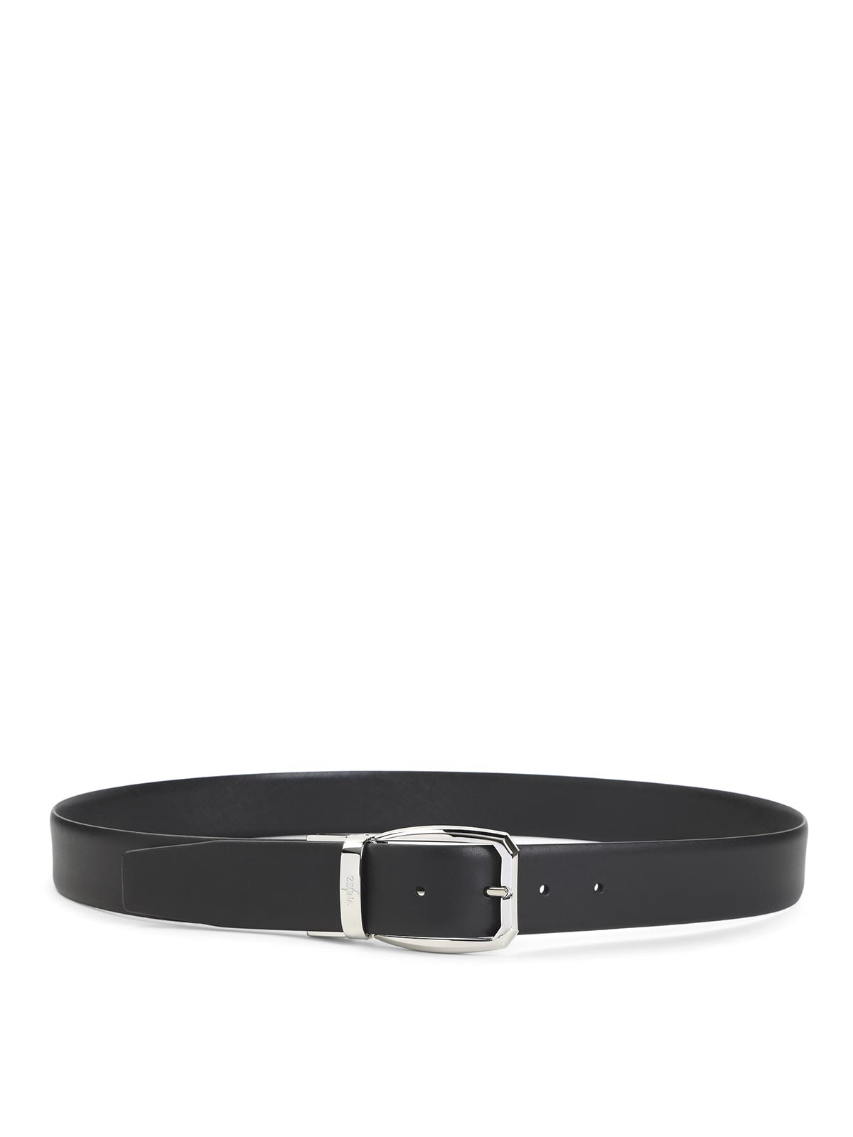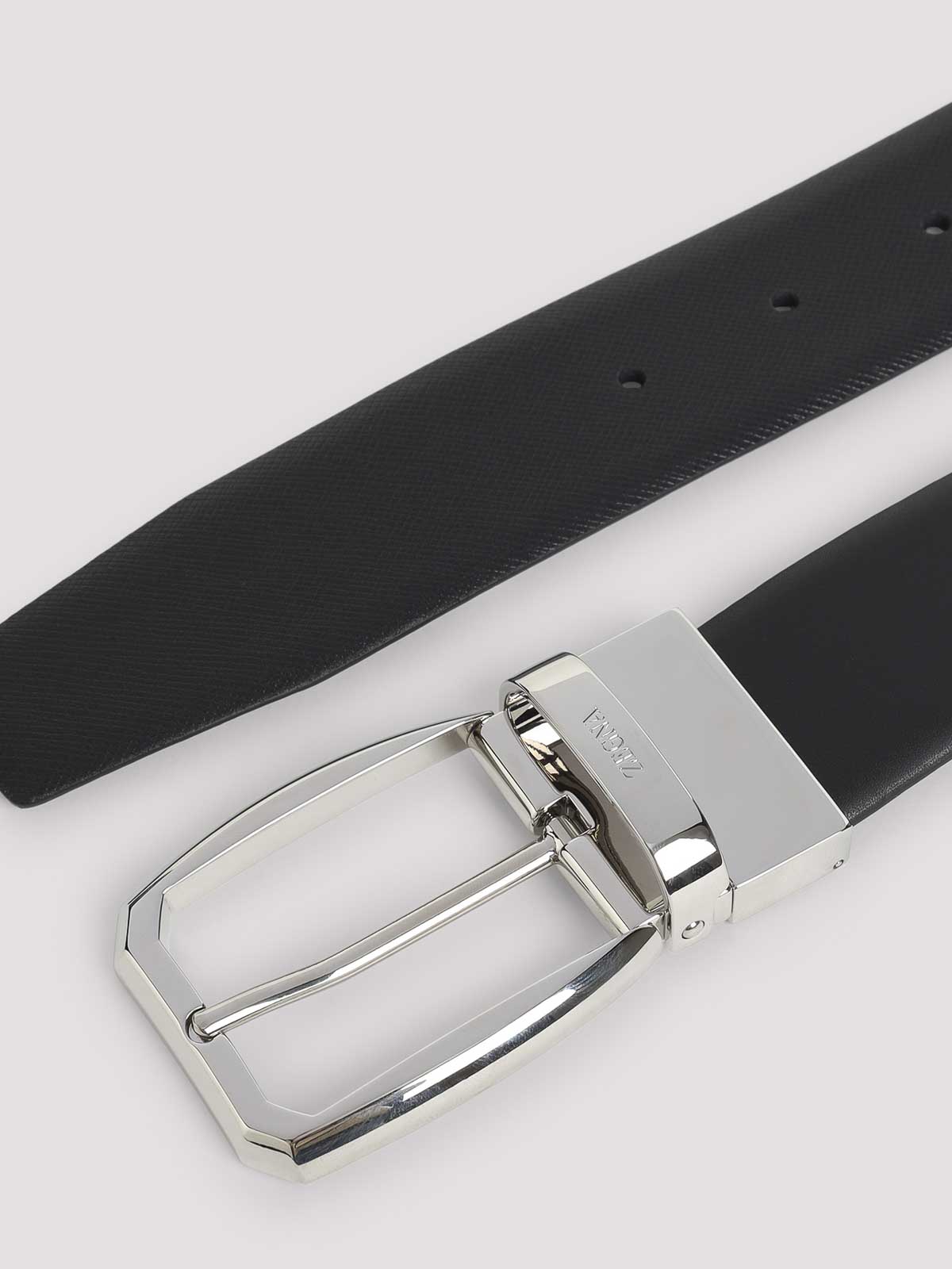ゼニアブラックカウレザーベルト。ピュアブラックのカウレザーベルト、フロントシルバートーンのメタリックバックル、シルバートーンのメタリックベルトループ、調節可能なデザイン。