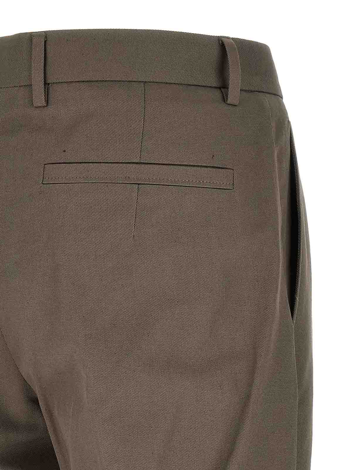 コットンとリネンの混紡パンツ、コットン裏地、テーラードカット、フロントピンサー、ストレッチプリーツ、ストレートレッグ、ジップフック、フロントボタンクロージャー、サイドに斜めポケット、バックウェルトポケット。