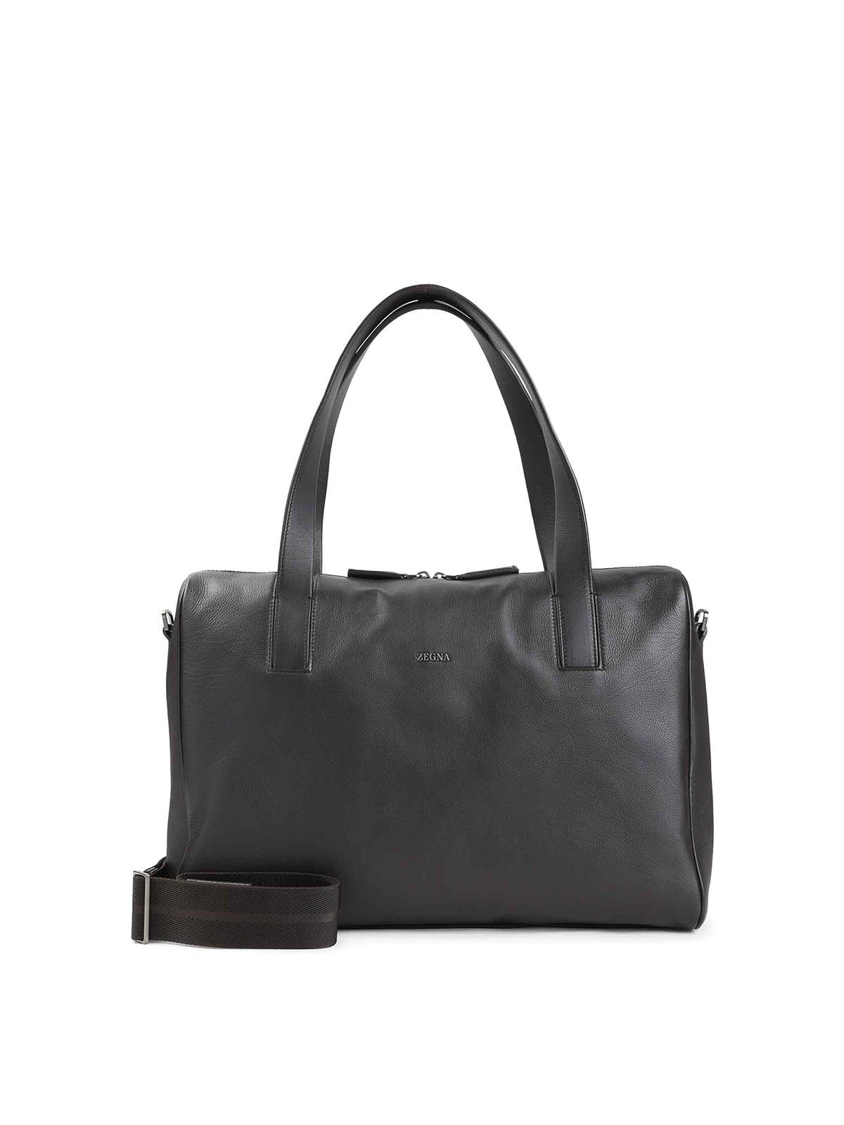 ゼニアダークブラウンのカーフレザートラベルバッグ。ピュアダークブラウンのカーフレザーバッグ、トップハンドル、トップツーウェイジッパー、フロントにレタリングロゴ、調節・取り外し可能なショルダーストラップ、メインコンパートメント1つ。