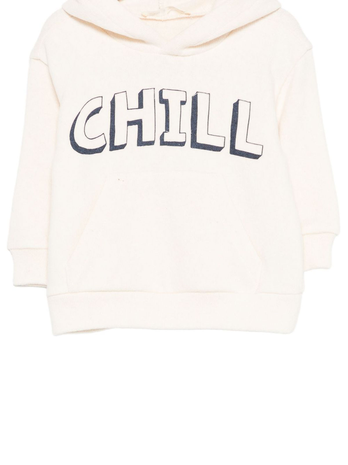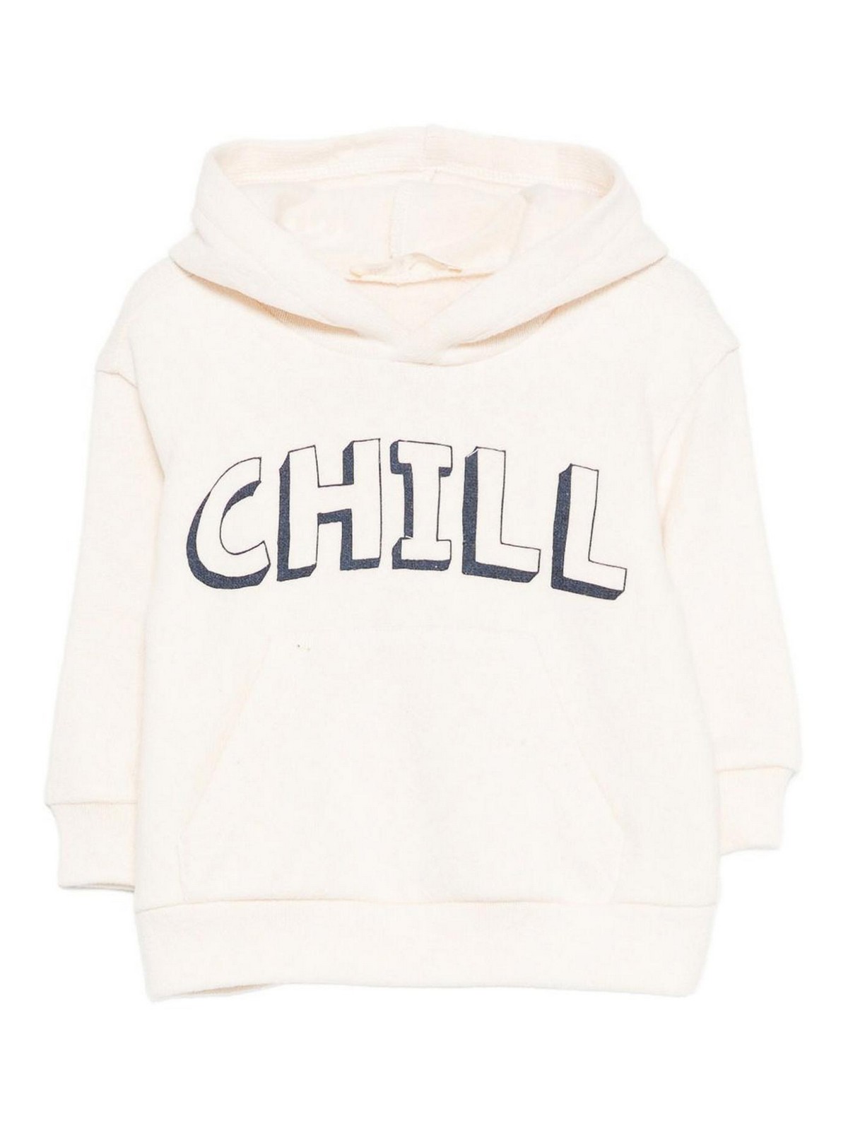 フード付きセーターはクリーム色のフード、前面にカンガルーポケットが付いています