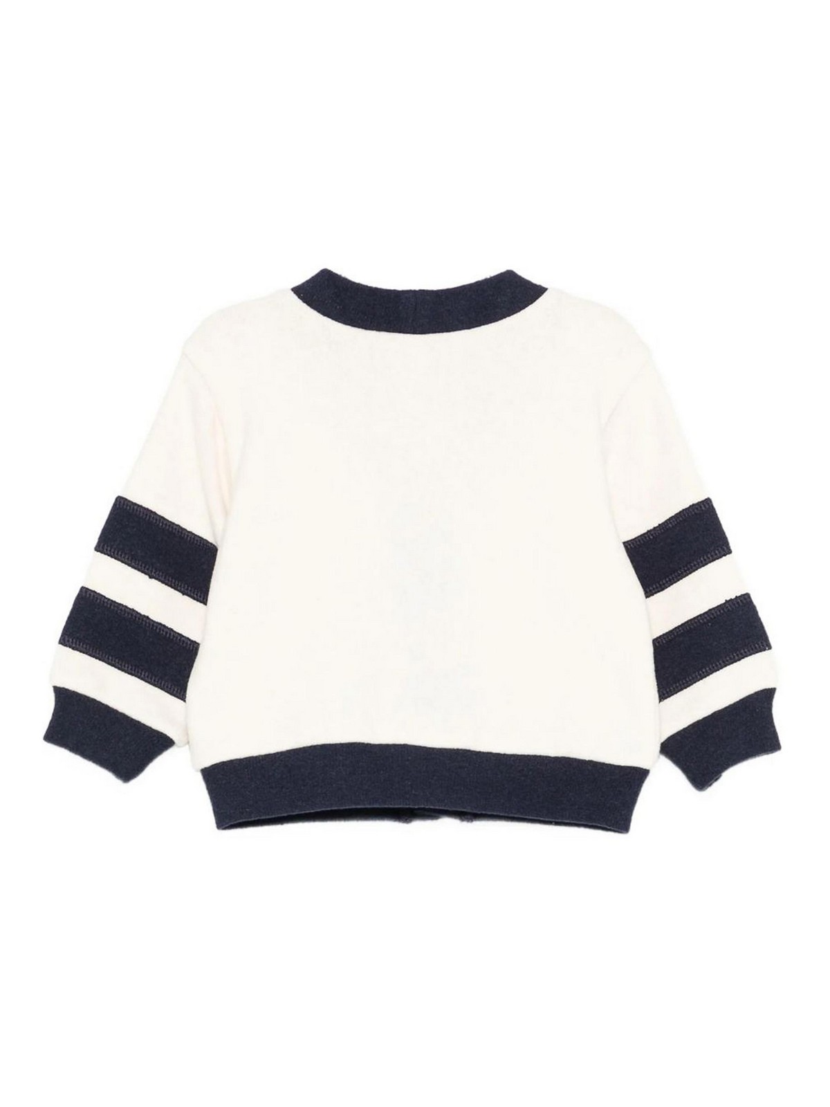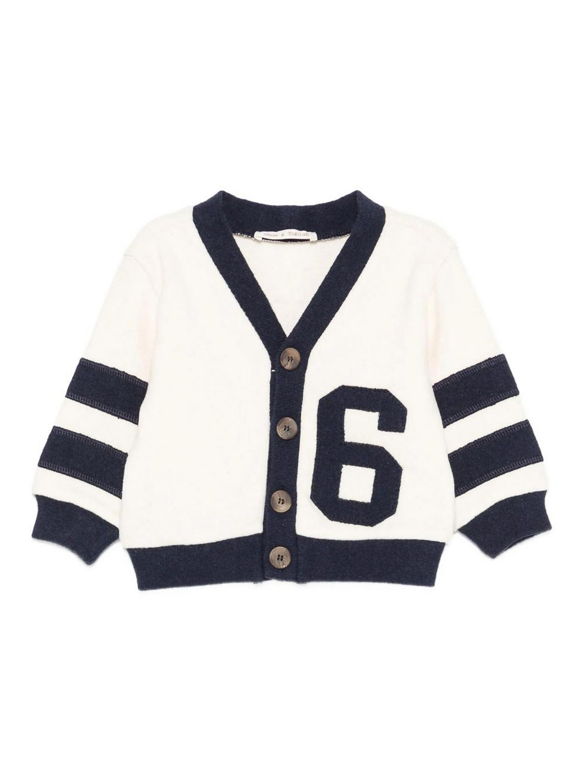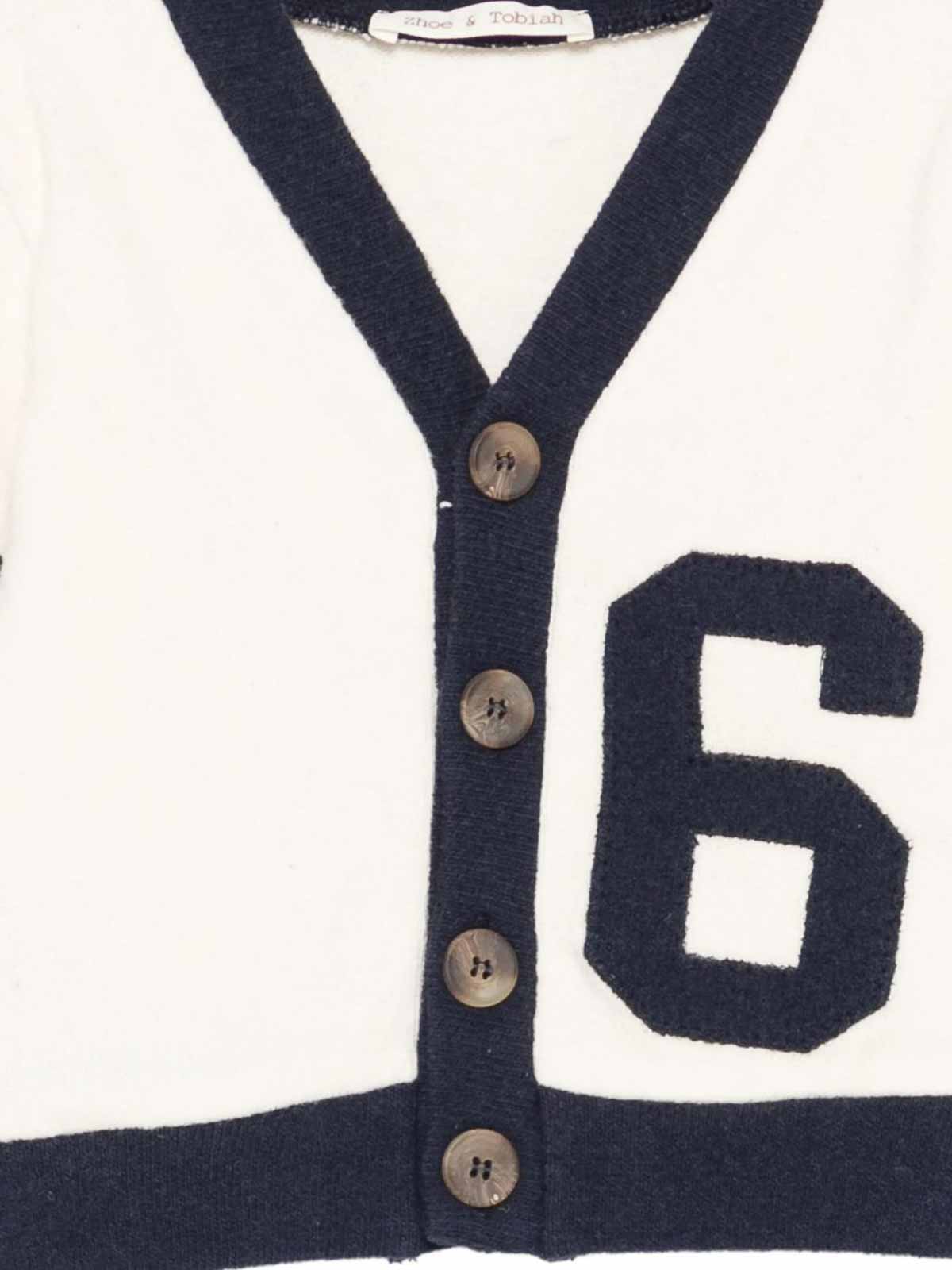 クリーム/ブルーフィーチャーズボタンカーディガン、番号付き Vネックロングスリーブ