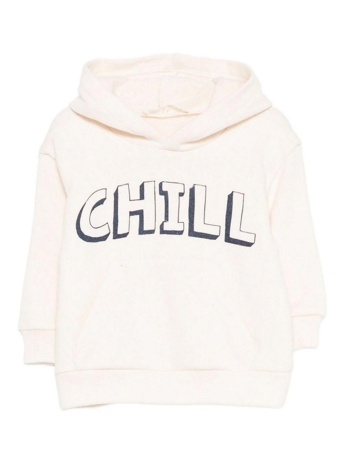 フード付きセーターはクリーム色のフード、前面にカンガルーポケットが付いています