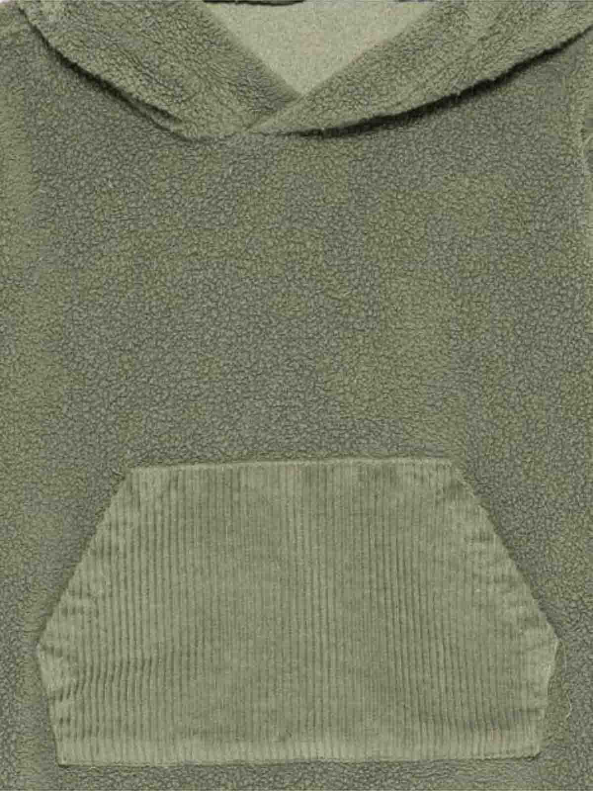パーカーは緑のリブ付きカンガルーポケット、長袖、リブ編みの裾、袖口が特徴です