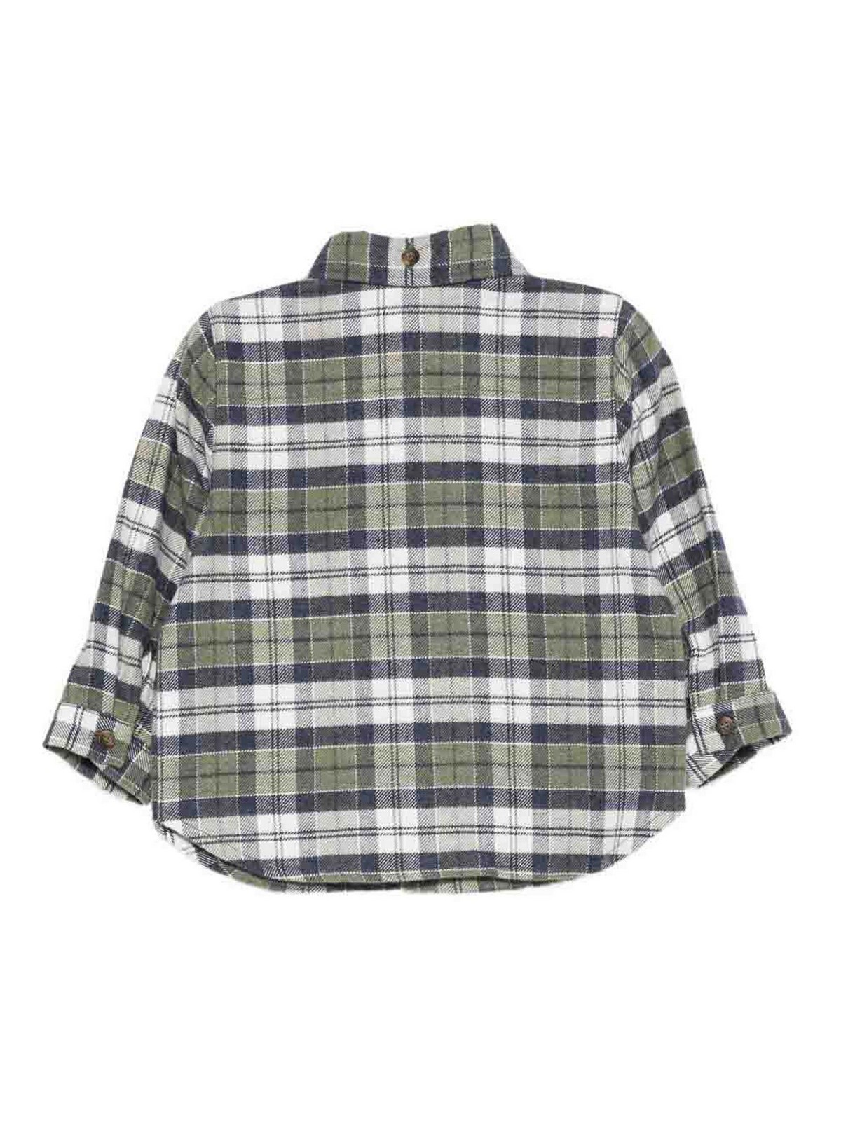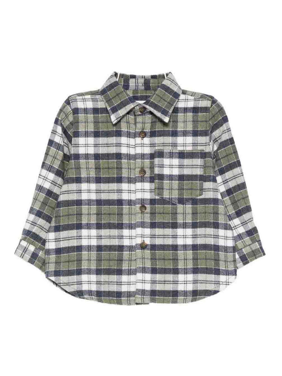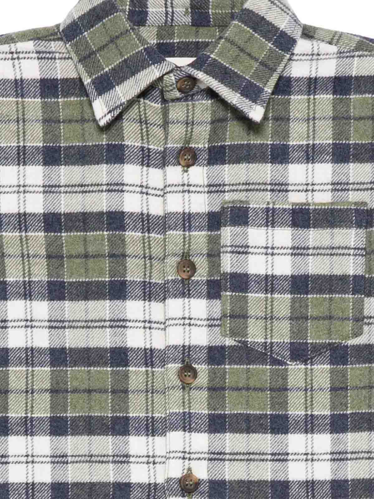 チェックシャツはブルー/アーミーグリーンのチェック柄、ボタン付き胸ポケット、長袖、ボタン付きヘムが特徴