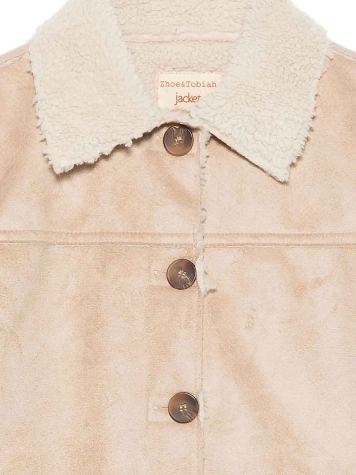 ボタン付きジャケットはベージュのフェイクカラーとボタン付きカフス、パッチポケットが特徴です
