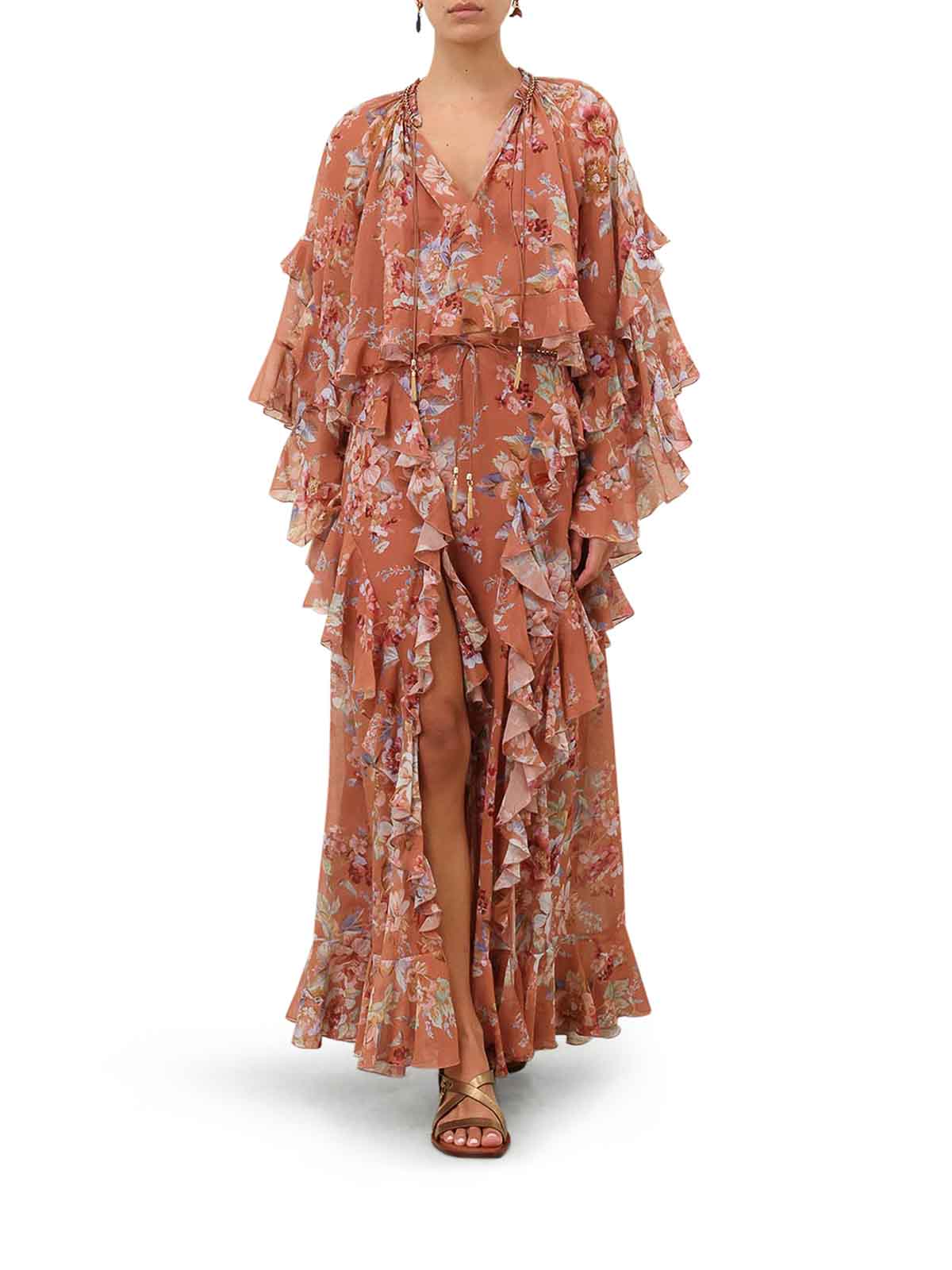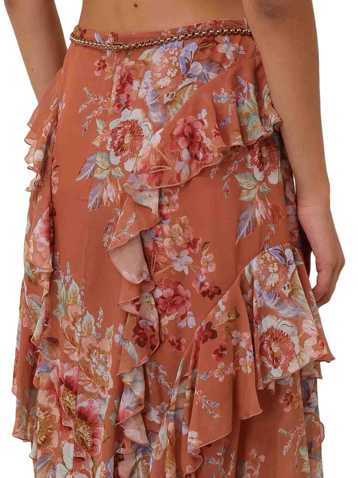 コットンとシルクの混紡生地、ミッドライズロングスカート、左右対称のフリルディテール、ボリュームのあるギャザー、両端にタッセルが付いた取り外し可能なコードベルト、フロントスリット、短い裏地、色:フローラルシナモン