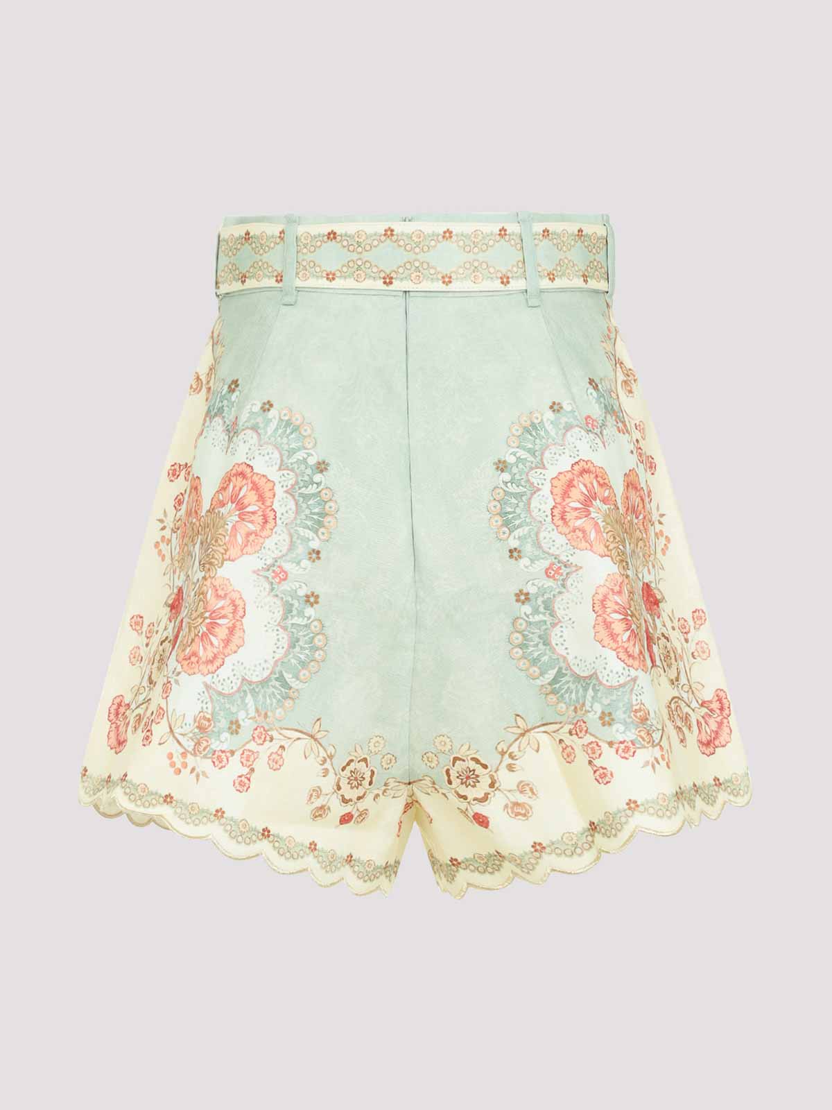 Zimmermann 壁紙フローラルミントグリーンリネンデイライトタックショーツ。ピュアリネンショーツ。バックファスナー留め、フロント調節可能なベルト、ベルトループ、フロントプリーツデザイン、アシンメトリーヘム。ミントグリーンの背景、壁紙マルチカラーフローラルデザイン。