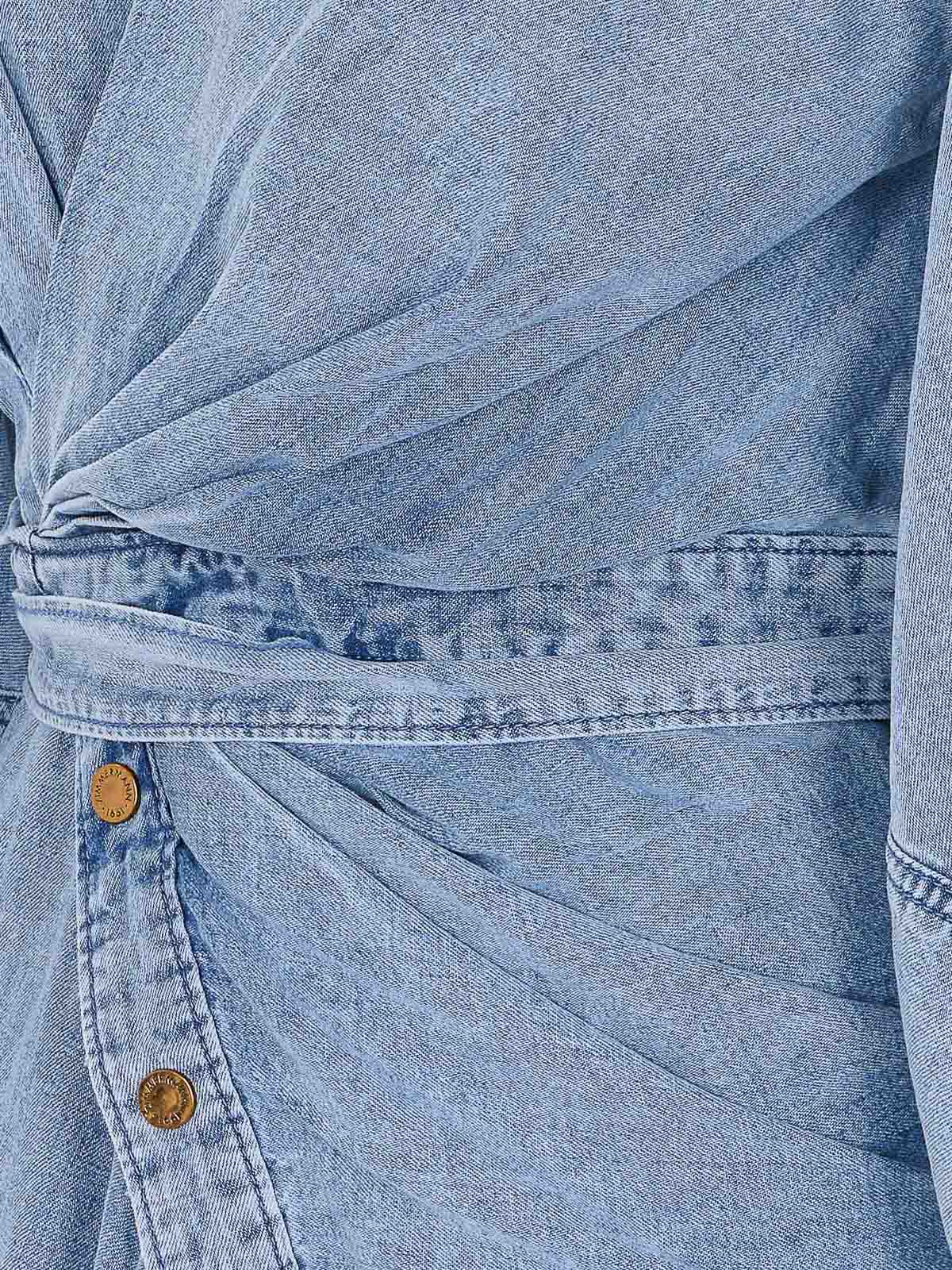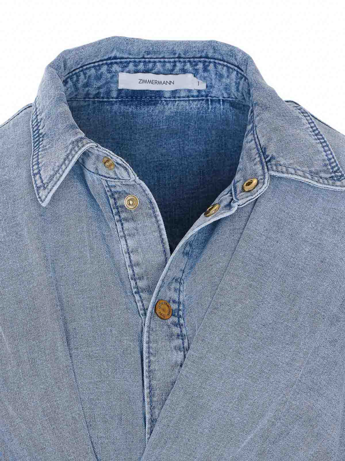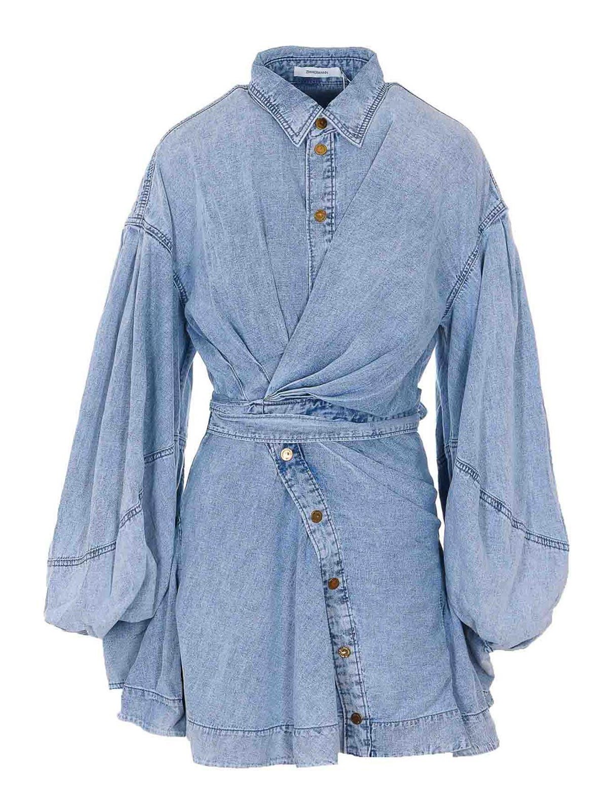 Zimmermann デニムドレス、ボタン留め、ロングスリーブ、レギュラーカラー、袖口にリボンディテール、レースディテール