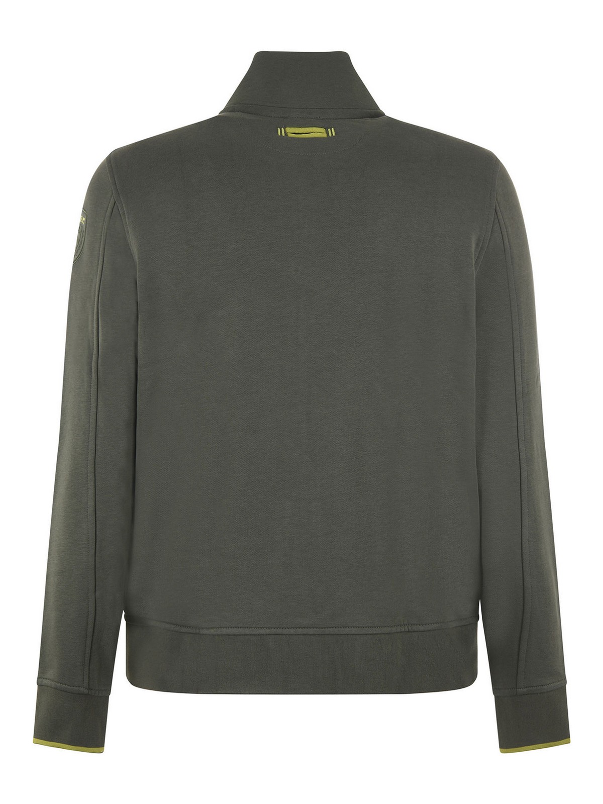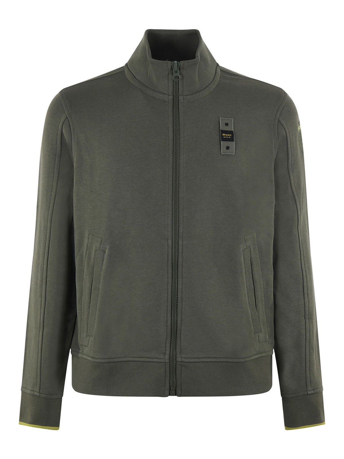 Blauer sweatshirt in military greencotton blend high collar contrasting profiles side pockets ribbed cuffs and bottom logo patch on the left sleeve and on the chest zip closure brushed interior size in photo m 85% cotton 15% polyester