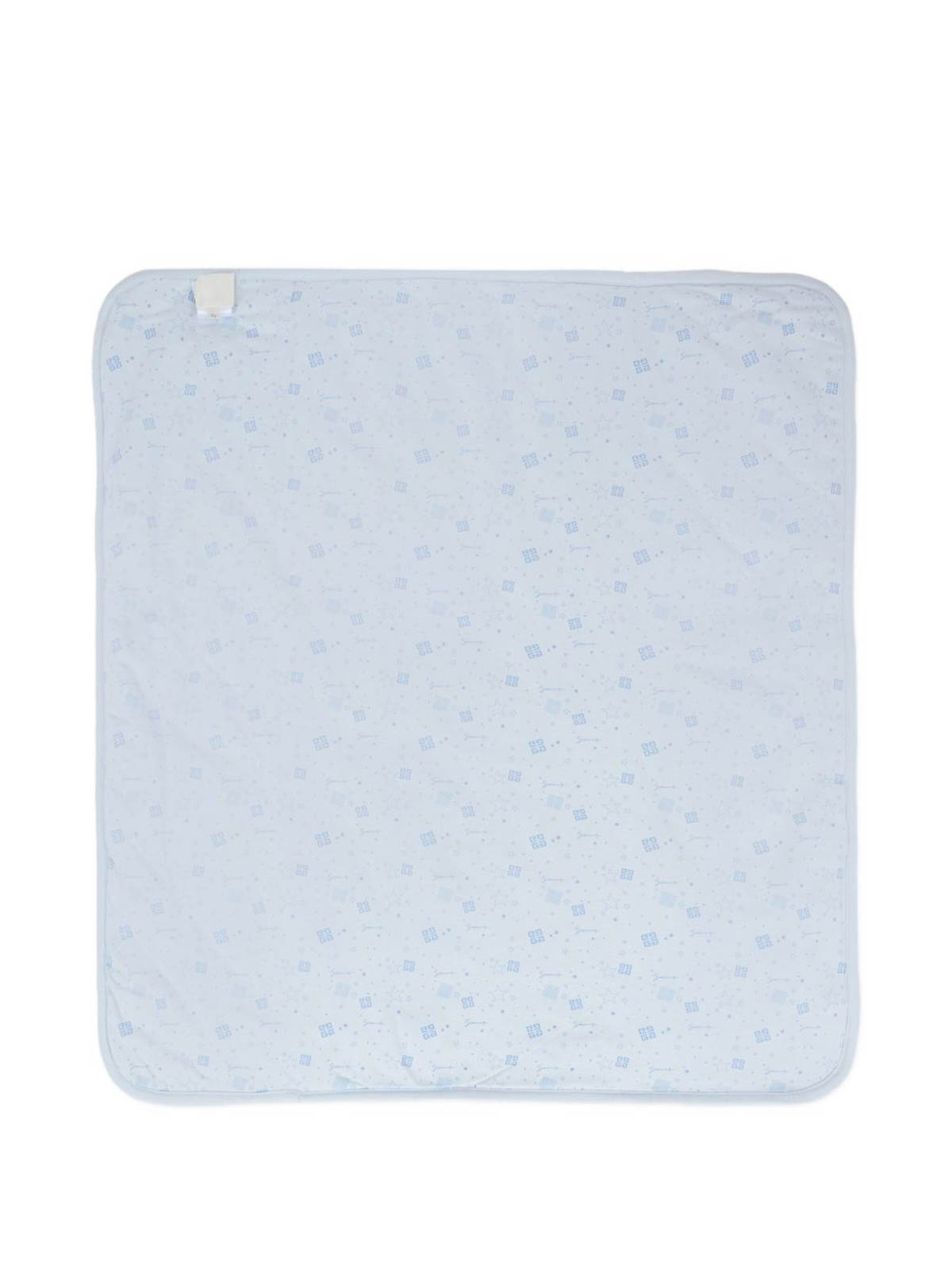 Light blue hat + blanket piece set, all-over graphic print, double layer design, stitching detail, logo detail