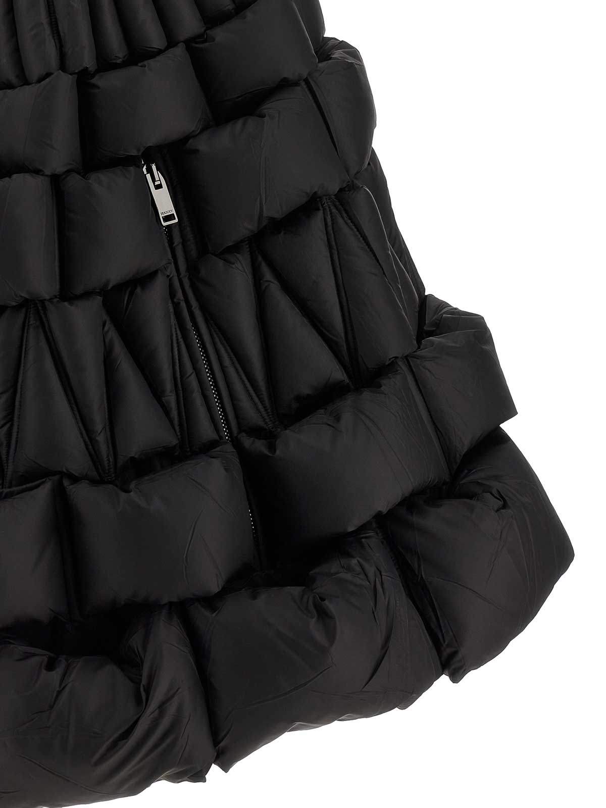 Nylon cape with braided 3d structure and goose feather padding, hood, high neck, front zip closure, side zip to pass hands.