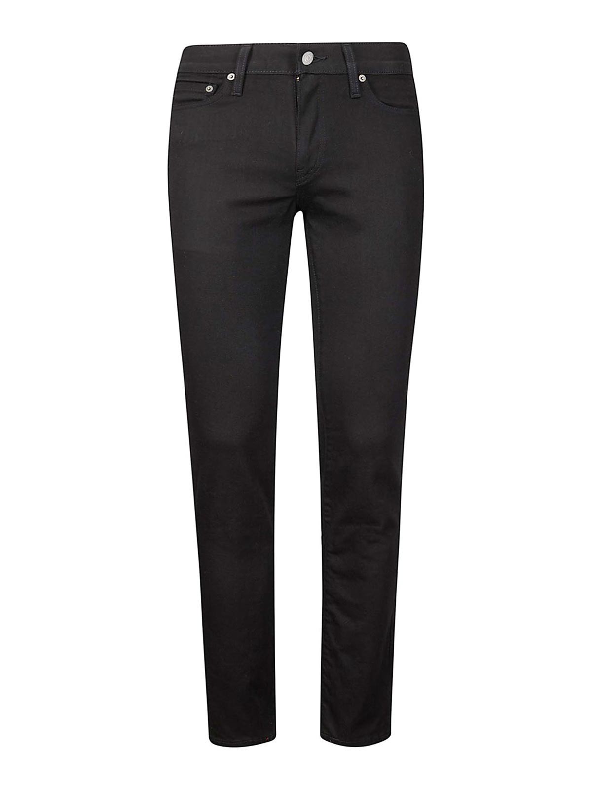Lightweight cotton jeans, narrow leg, comfortable waist, black stitching.