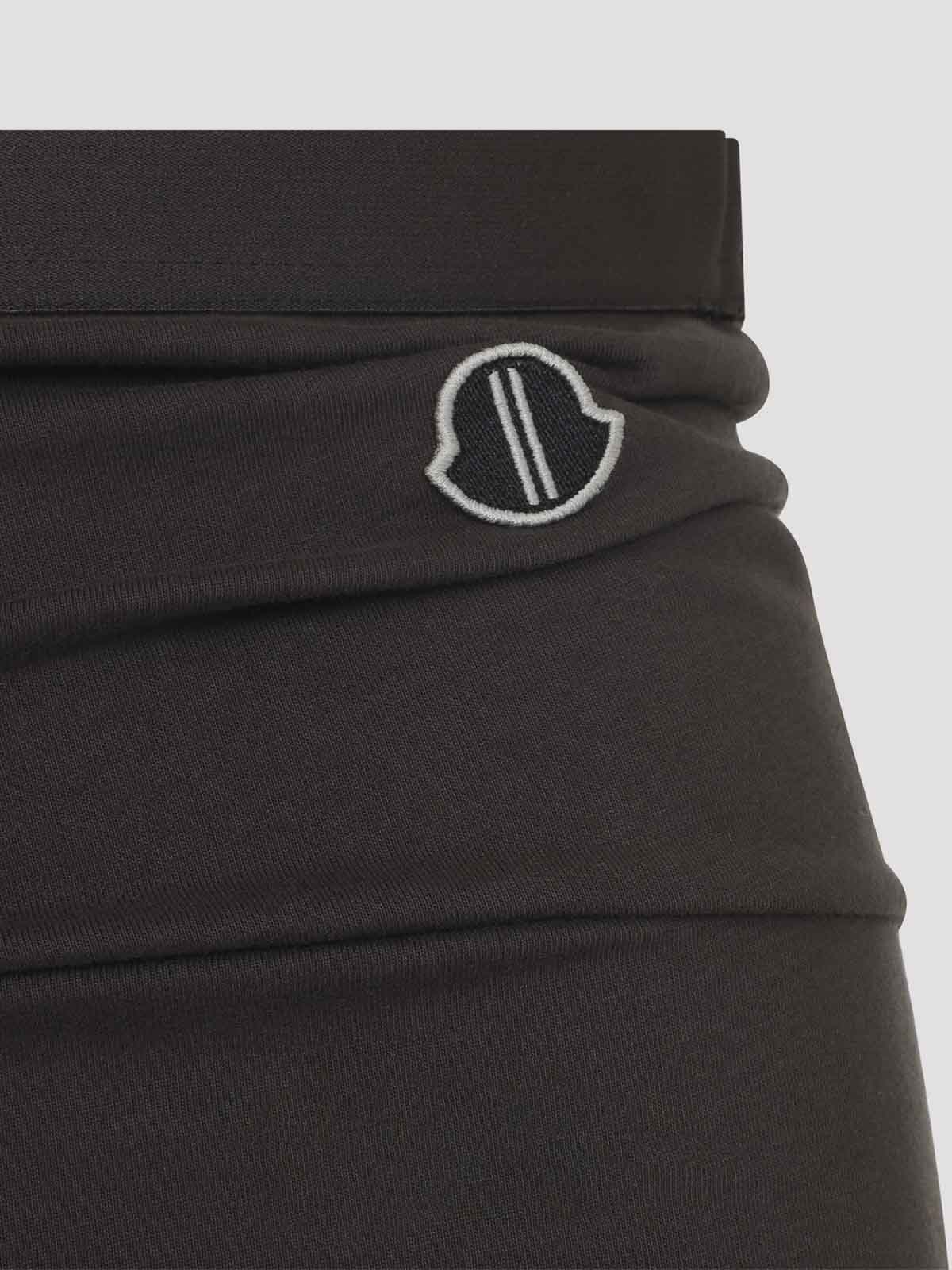 Moncler x rick owens dark dust adjustable skirt. dark dust medium-weight cotton jersey trails floor length, slit on the right leg. elasticized waistband and a slim fit. drapes and wraps around the hips, and gathers into a seam on the right thigh. side split can be modified using the drawstring. higher, or lower, split creates increased draping and ruching. train lays floor length to the left. moncler + rick owens embroidered logo patch on the left hip.