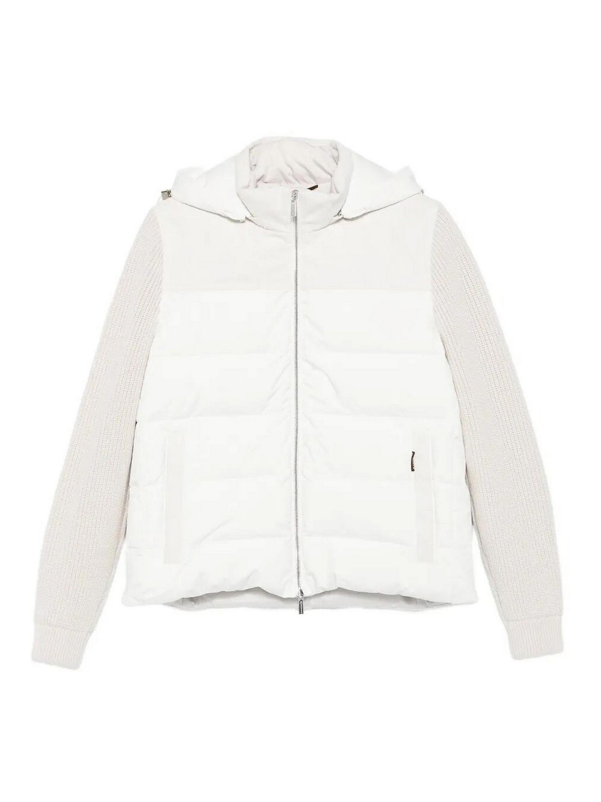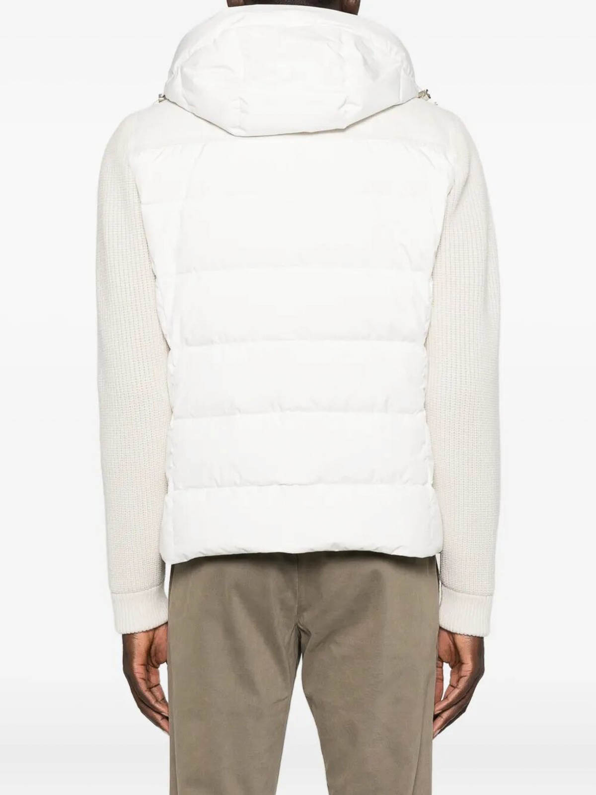 Ivory quilted design, hooded neckline, zip closure, long sleeves, knitted cuffs and sleeve inserts