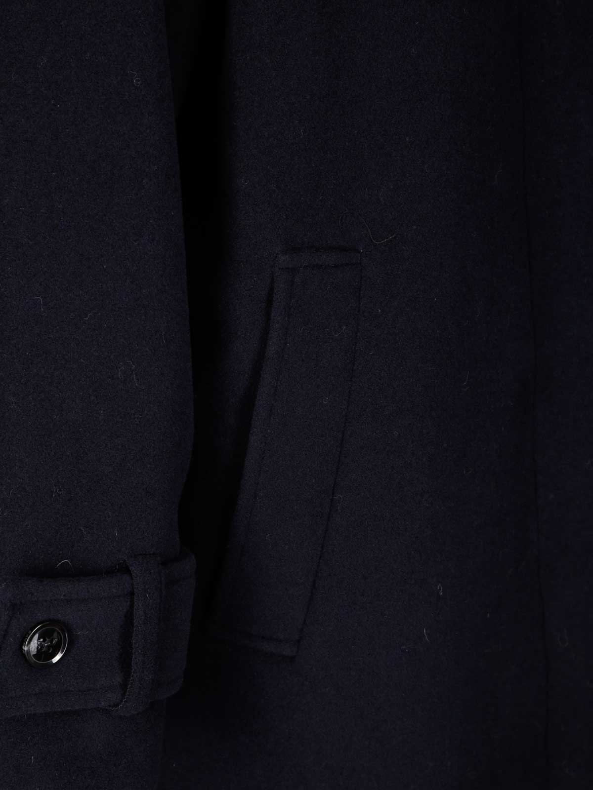 Single-breasted wool blend coat, front buttoning closure, classic collar and two side welt pockets.