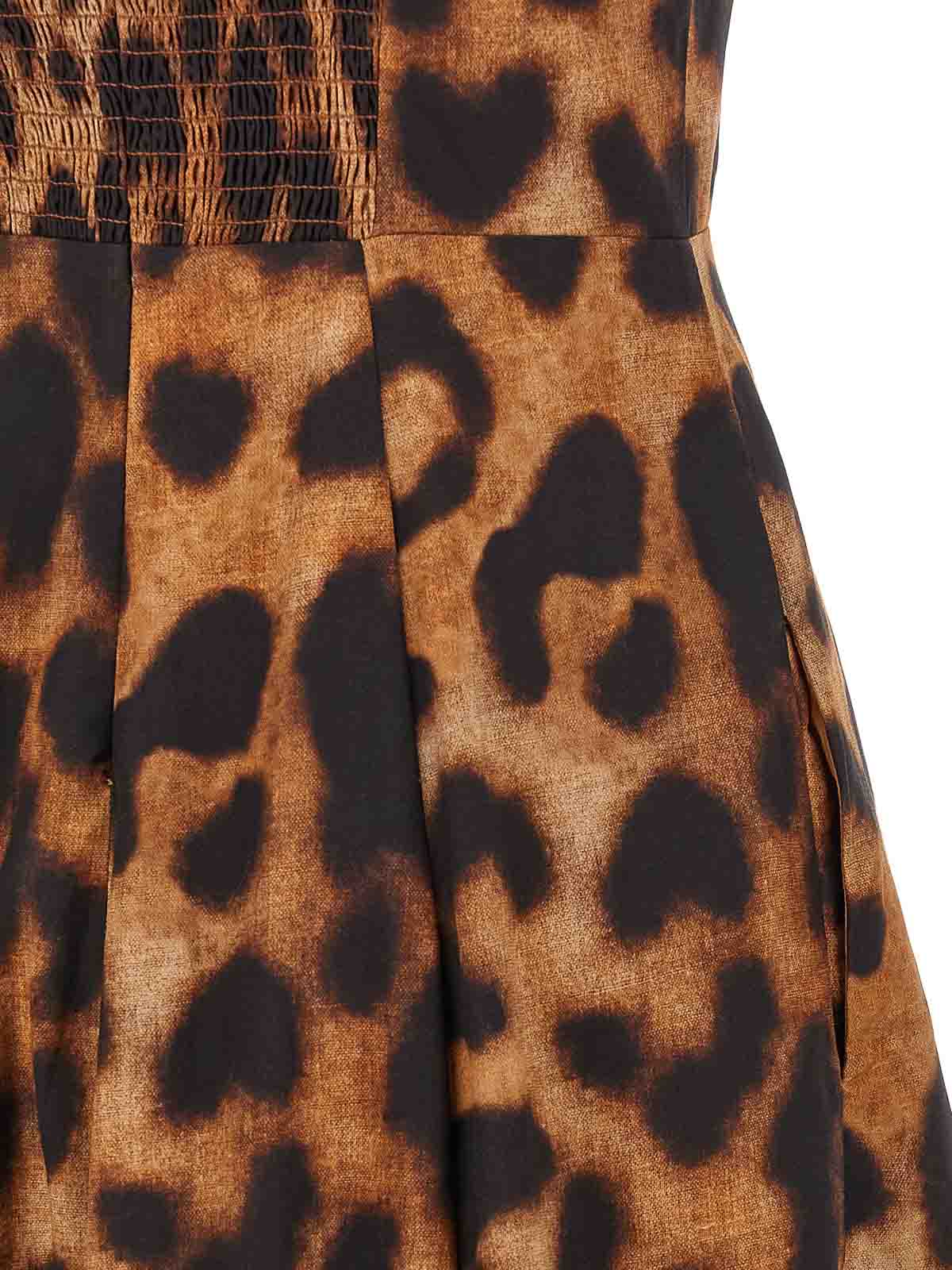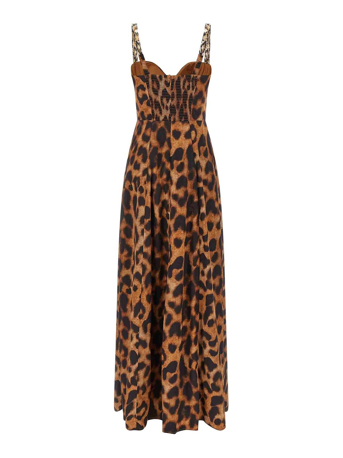 Long dress in tencel cotton blend animal print, sutton beaded shoulder straps, sleeveless, bustier with slightly padded preformed cups, smock stitch and back zip closure, wide skirt, pockets, lining.