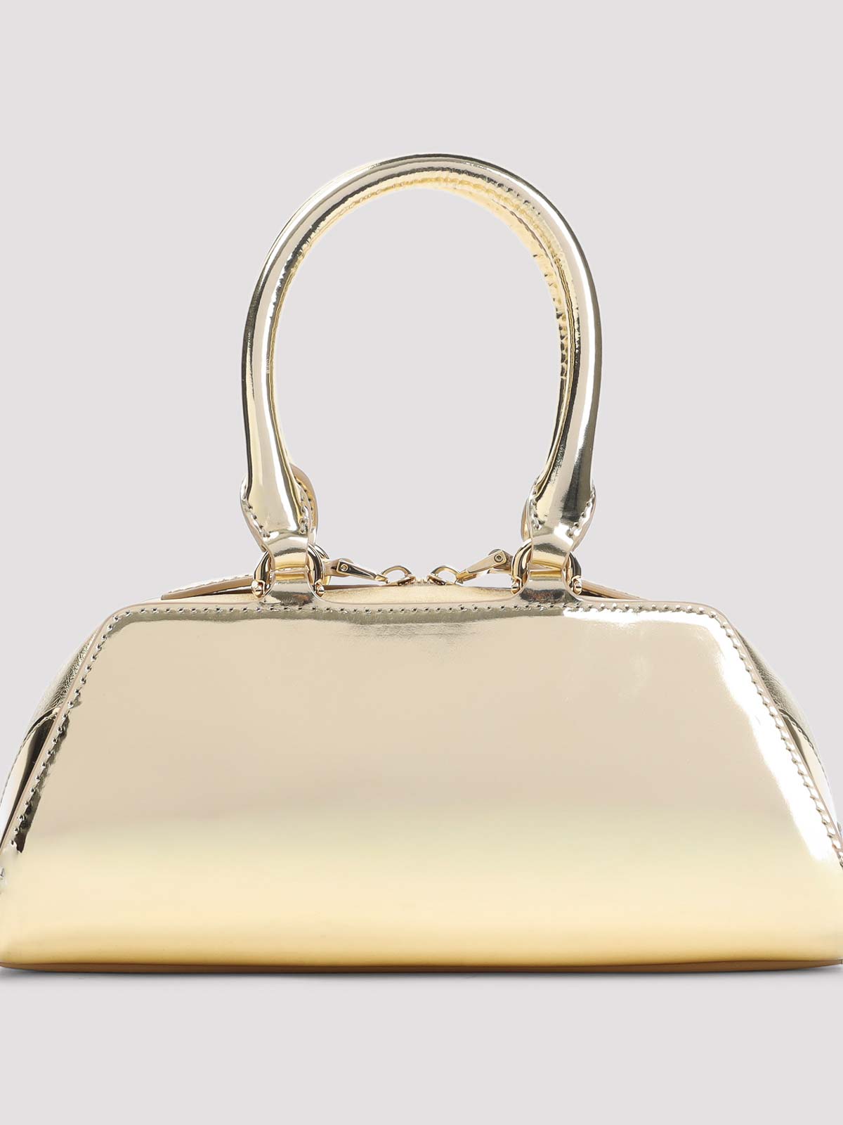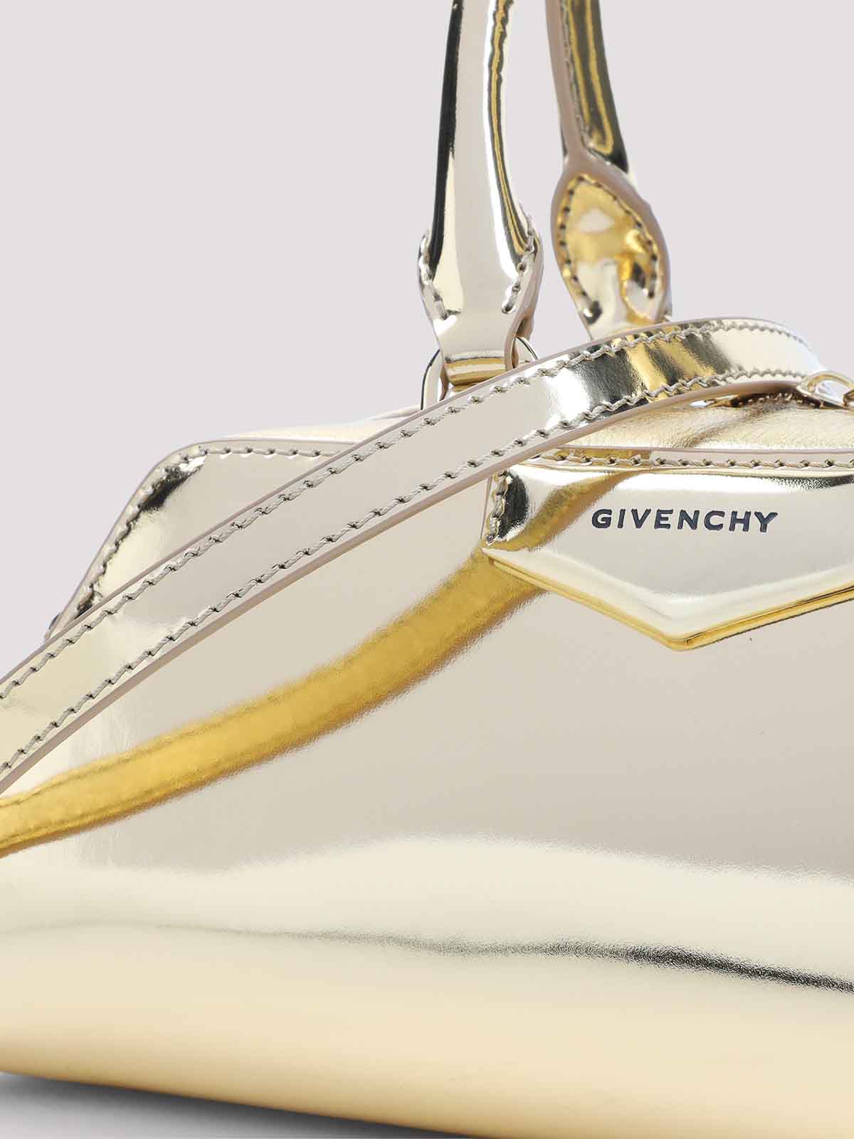 Givenchy antigona ew mini golden handbag crafted from golden tonal hardware top handles two, way zip pentagonal patch with logo attachable and adjustable shoulder strap one main compartment lined