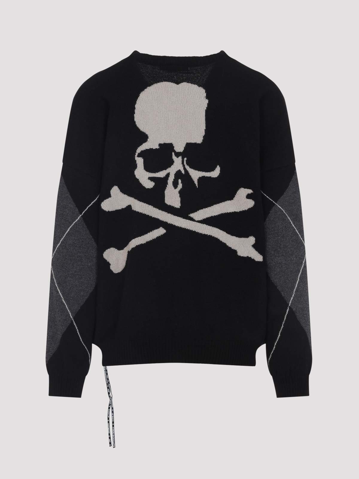 Mastermind world black argyle cardigan pure black cardigan v, neck buttoned back skull design long sleeves ribbed cuffs and hem side tonal strap straight hem grey design on the sleeves
