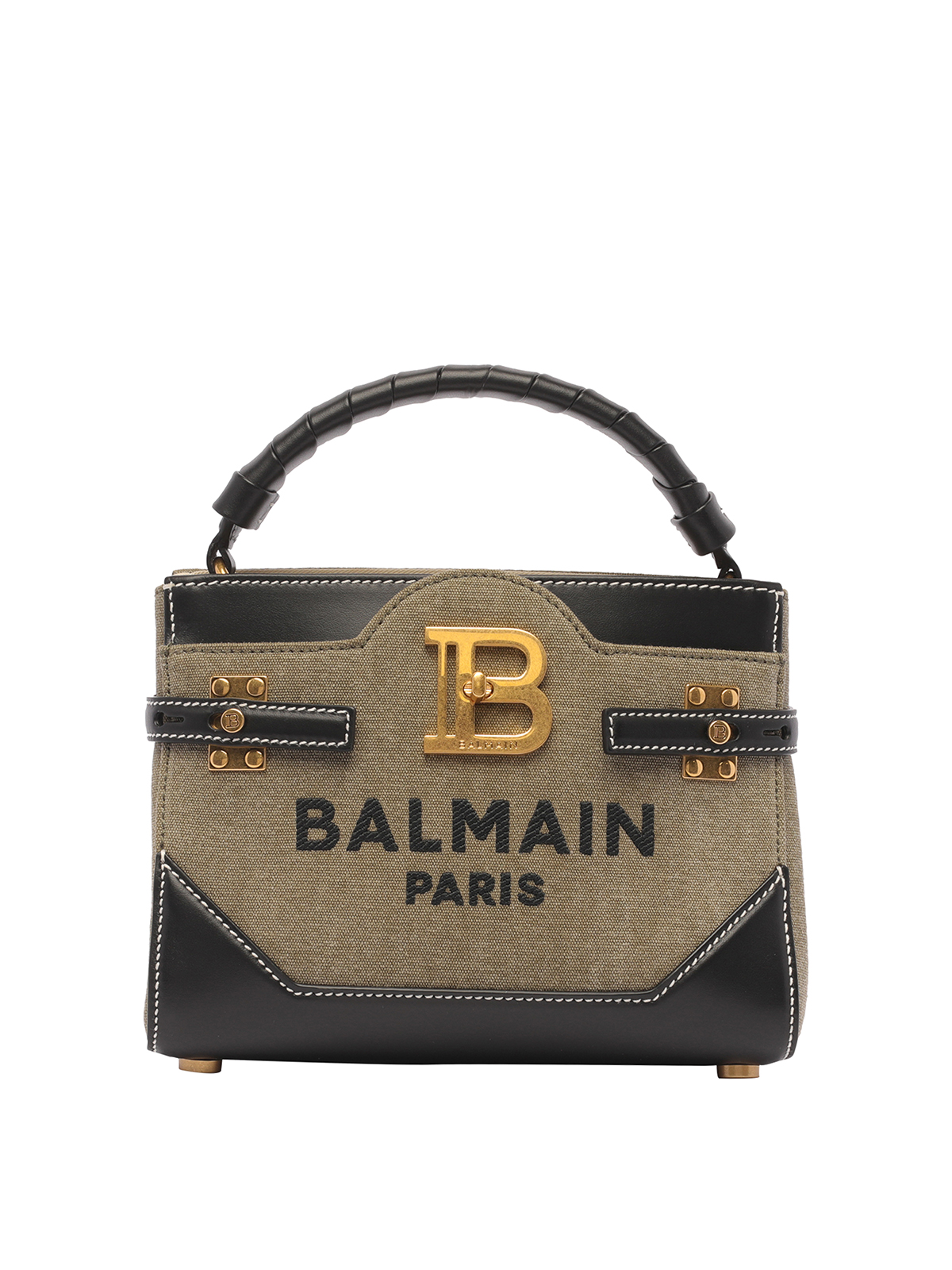 Balmain kaki green b-buzz handbag inner clip pocket one slot external pocket with turn lock closure one handle adjustable and removable strap logo on fr