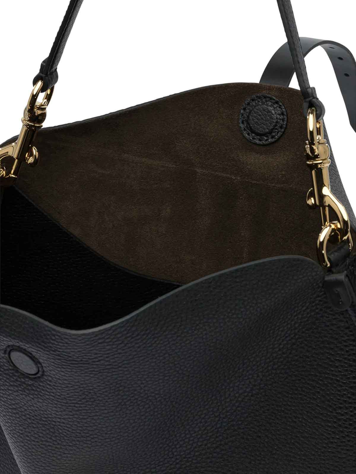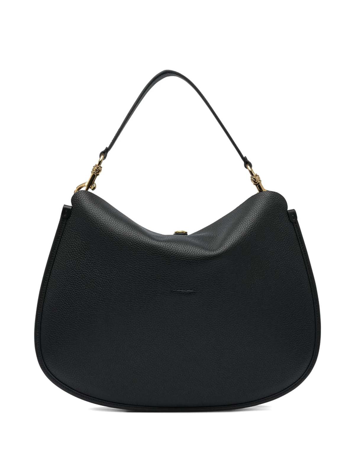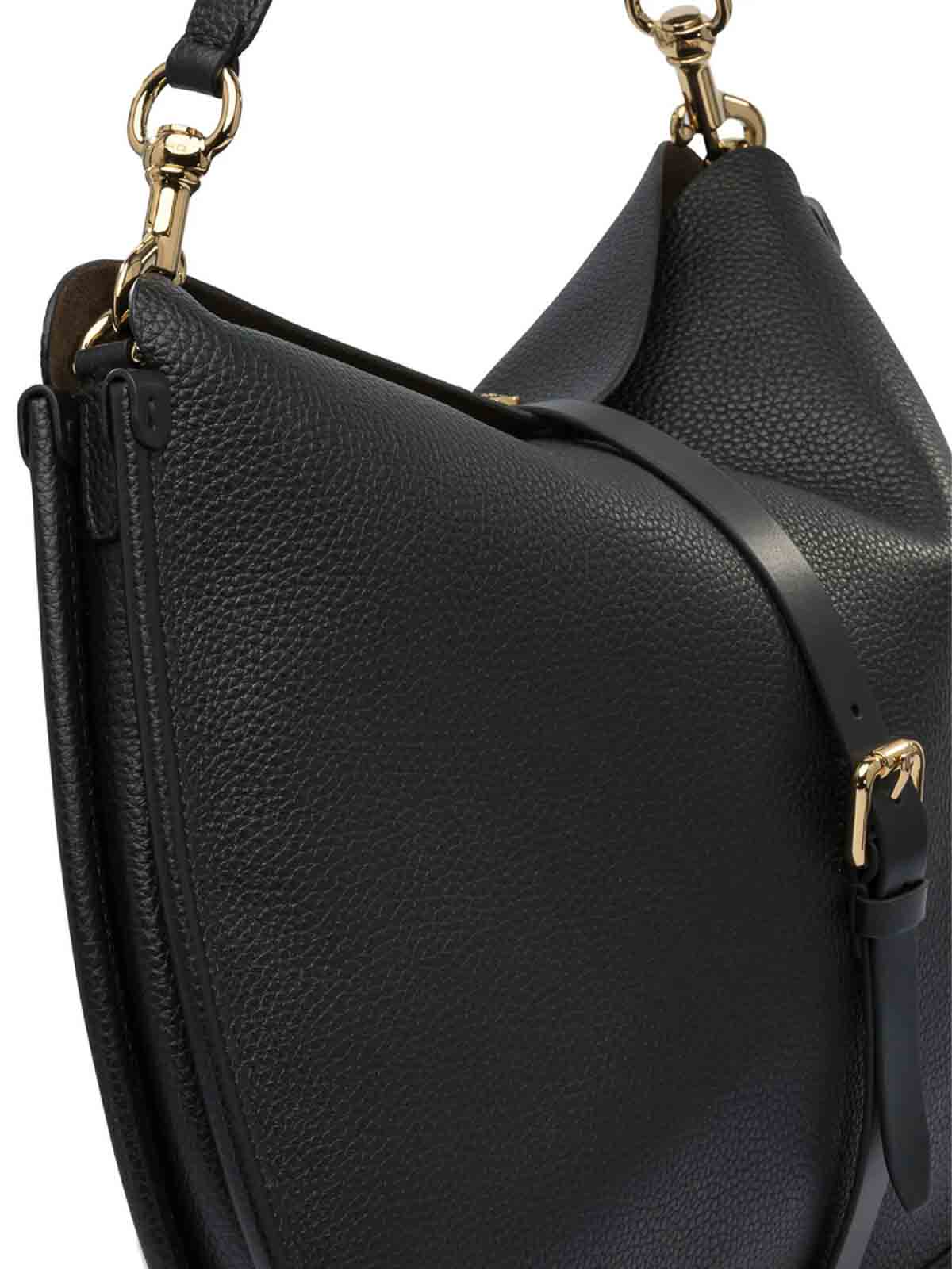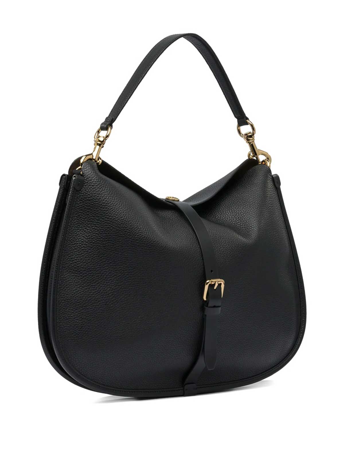 Black pebbled buckle strap top curved silhouette, tone hardware