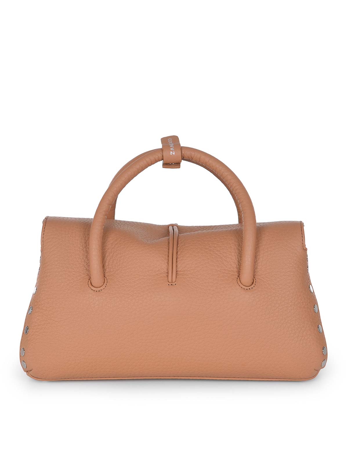 Zanellato dotta s bag made of hammered leather in biscotto color. silver metal inserts. stud detail applied on the sides. two handles. magnetic roll-top closure with tubular twist-lock ribbons. lined interior. leather logo patch applied inside. internal wall pocket with zipper. double compartment. can be carried by hand, on the shoulder, or crossbody. adjustable, removable leather shoulder strap. measurements: width 32cm, height 17cm, depth 15.5cm handle 16cm 100% leather made in italy