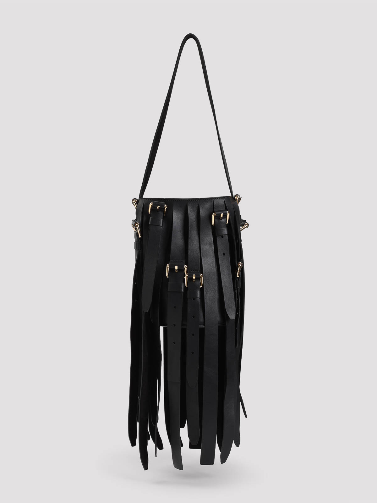 Moschino black leather bag. pure black leather bag, top adjustable shoulder strap, adjustable strap details all-over, one main compartment, gold-tone hardware.