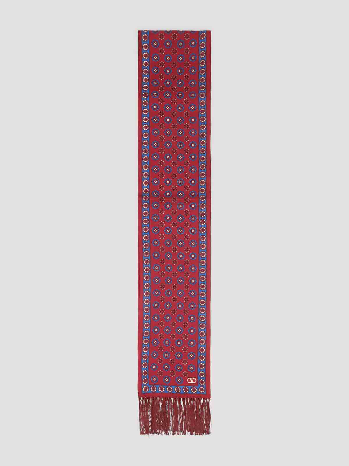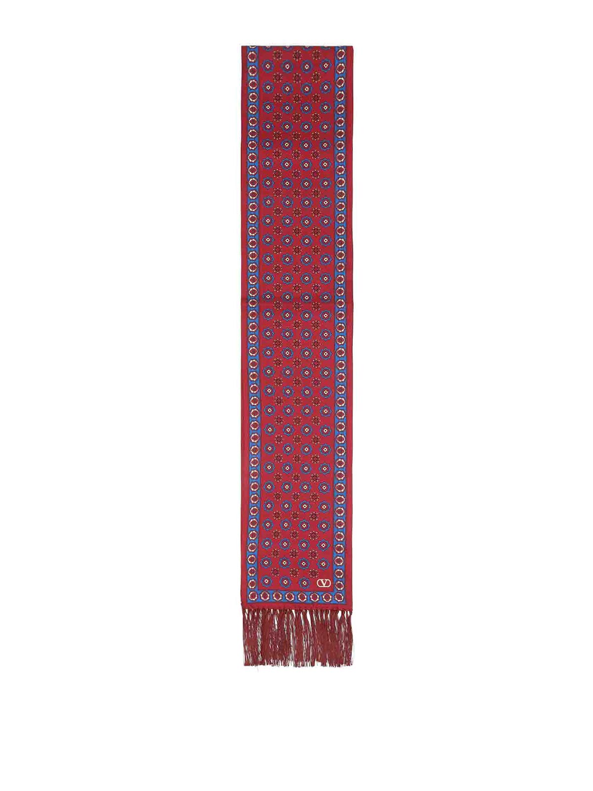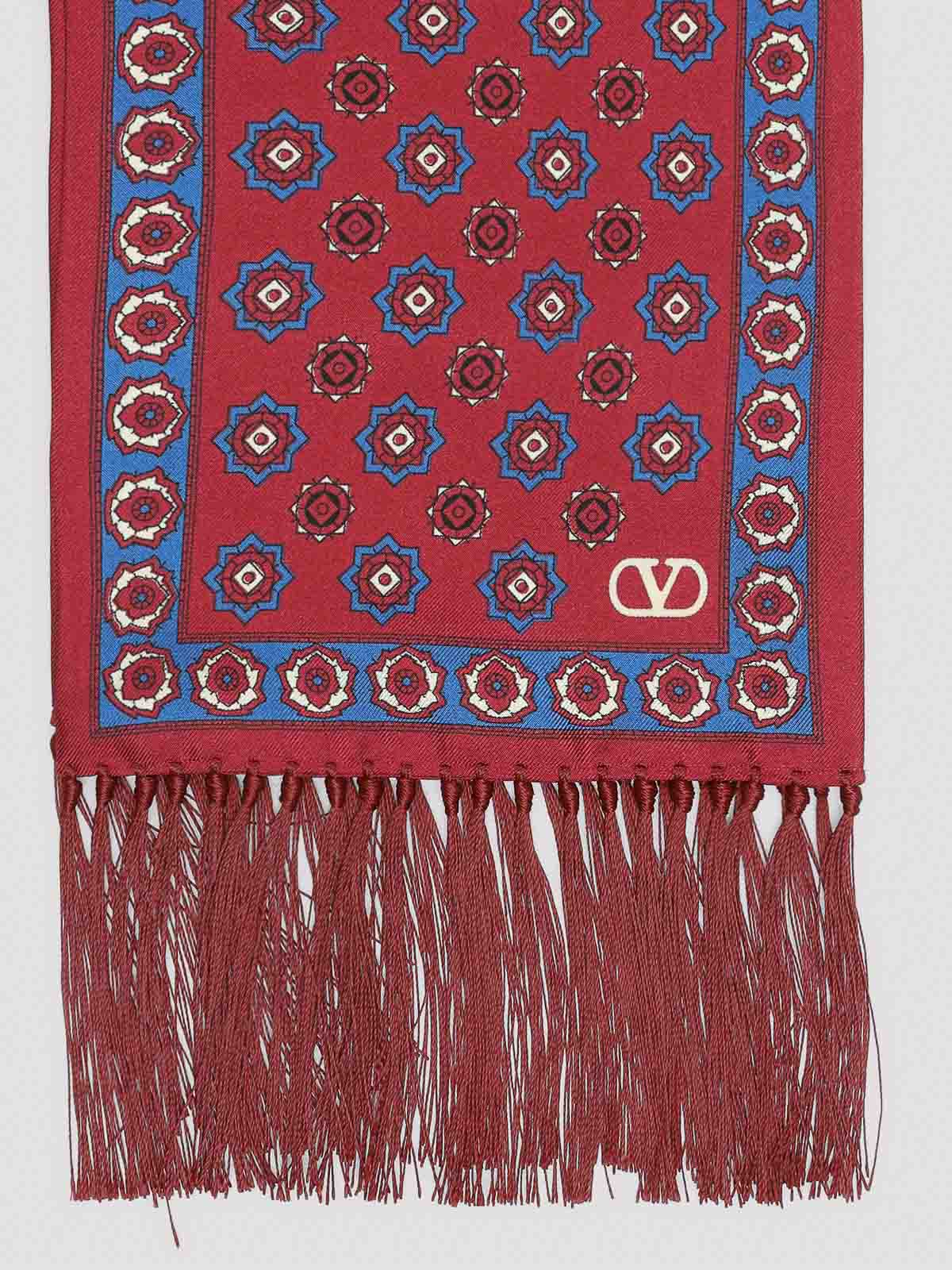 Valentino garavani red silk bandeau scarf. pure silk scarf, red fringed details, tonal stitching, side ivory white signature v-logo. red background with blue and ivory white geometric pattern all-over.