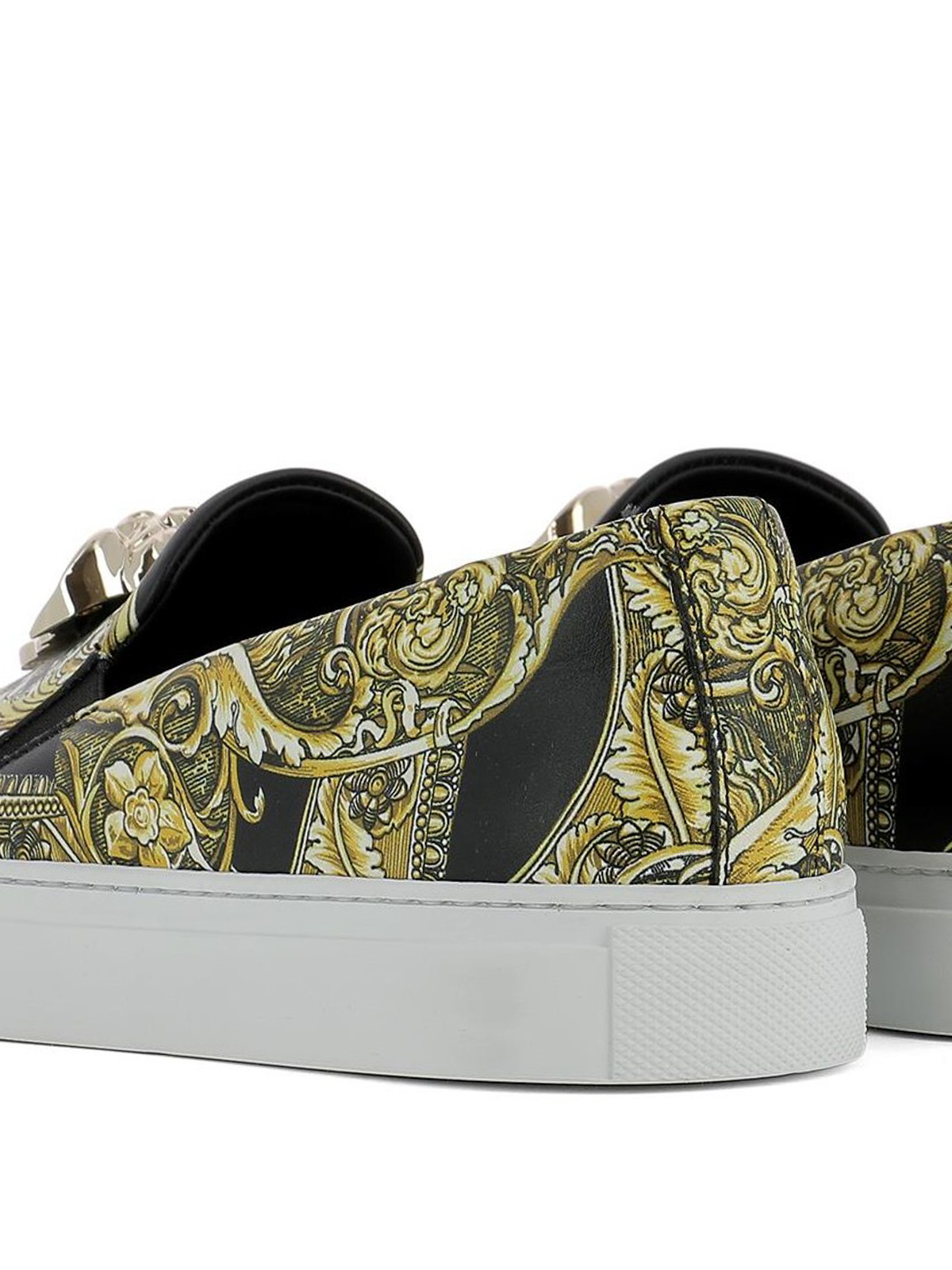 All-over baroque printed leather slip-ons featuring elasticated inserts at sides, iconic metal Medusa Head at front, rubber sole.