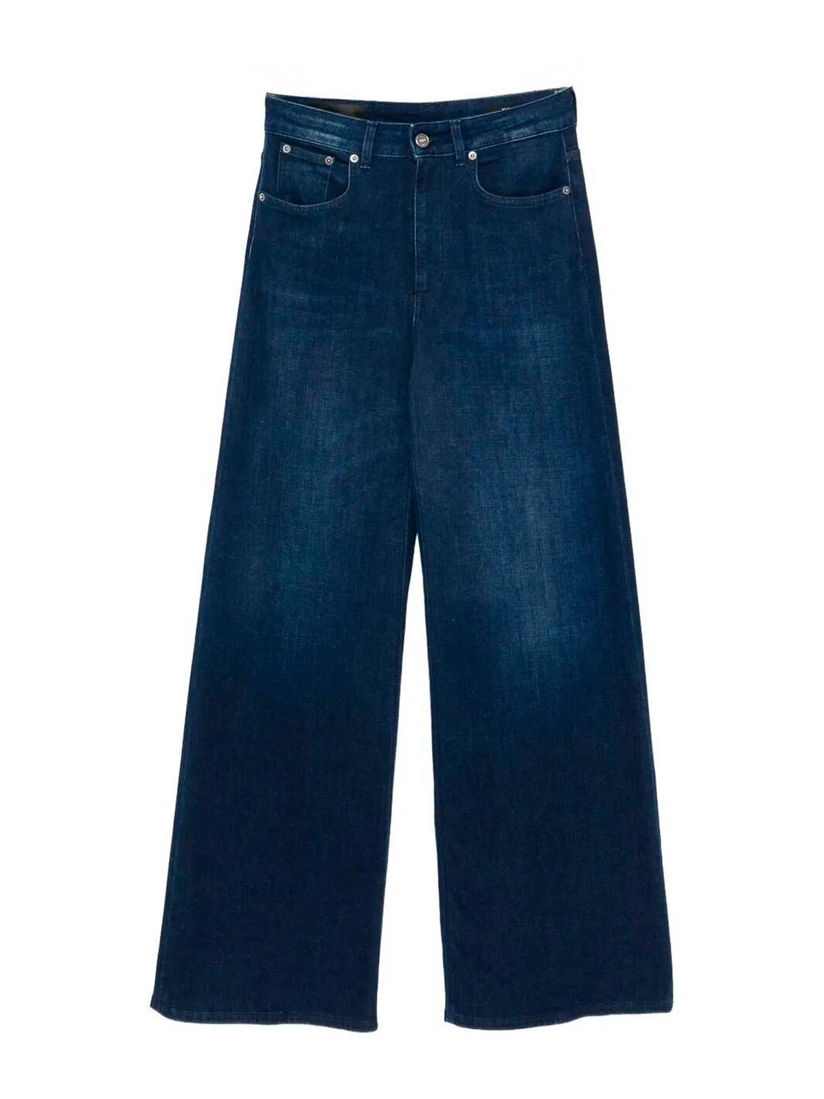 Beatrix five pocket wide leg fit jeans, regular waist and palazzo leg, 10 oz blue left hand stretch denim, clean dark wash.