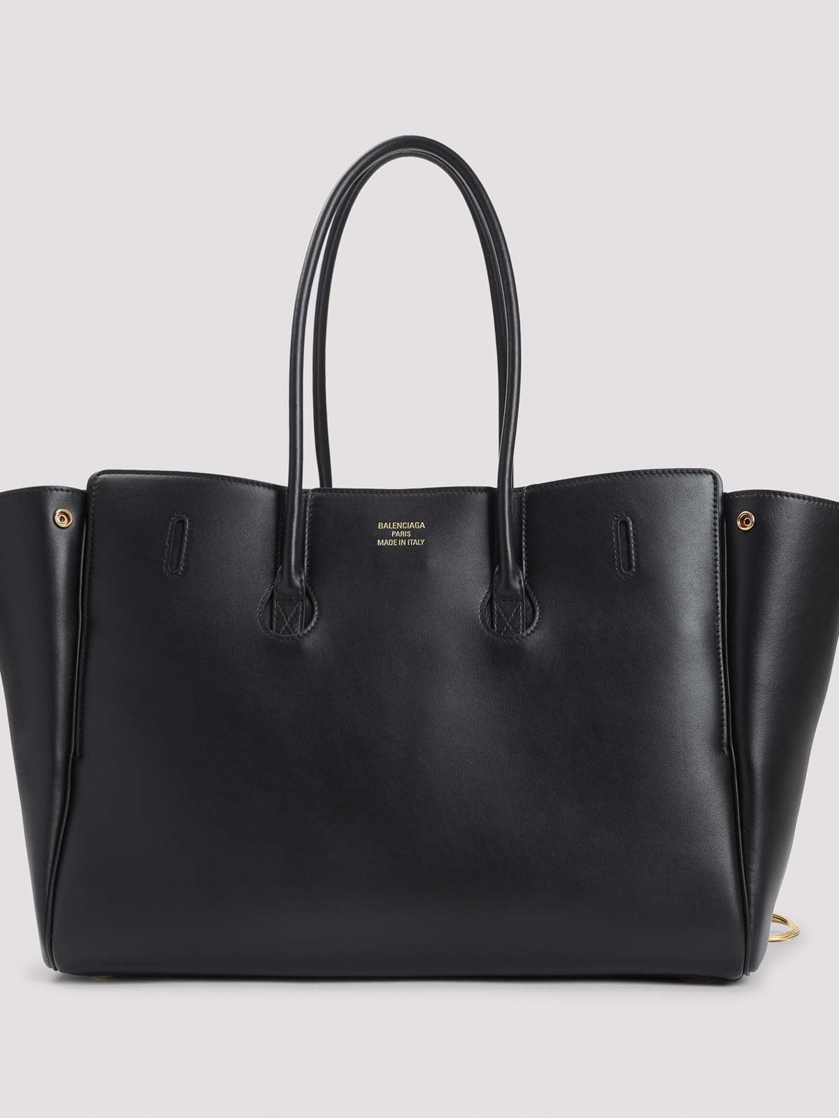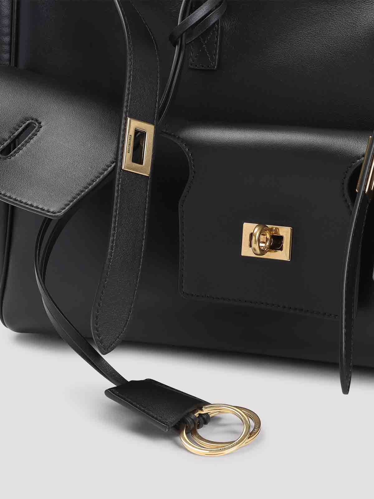 Balenciaga bel air carry m black handbag crafted from black aged, tone hardware turn lock with straps pocket on the top expandable design with snap buttons on the sides stamped logo on the back detachable keychain attachable and adjustable shoulder strap four pockets lined