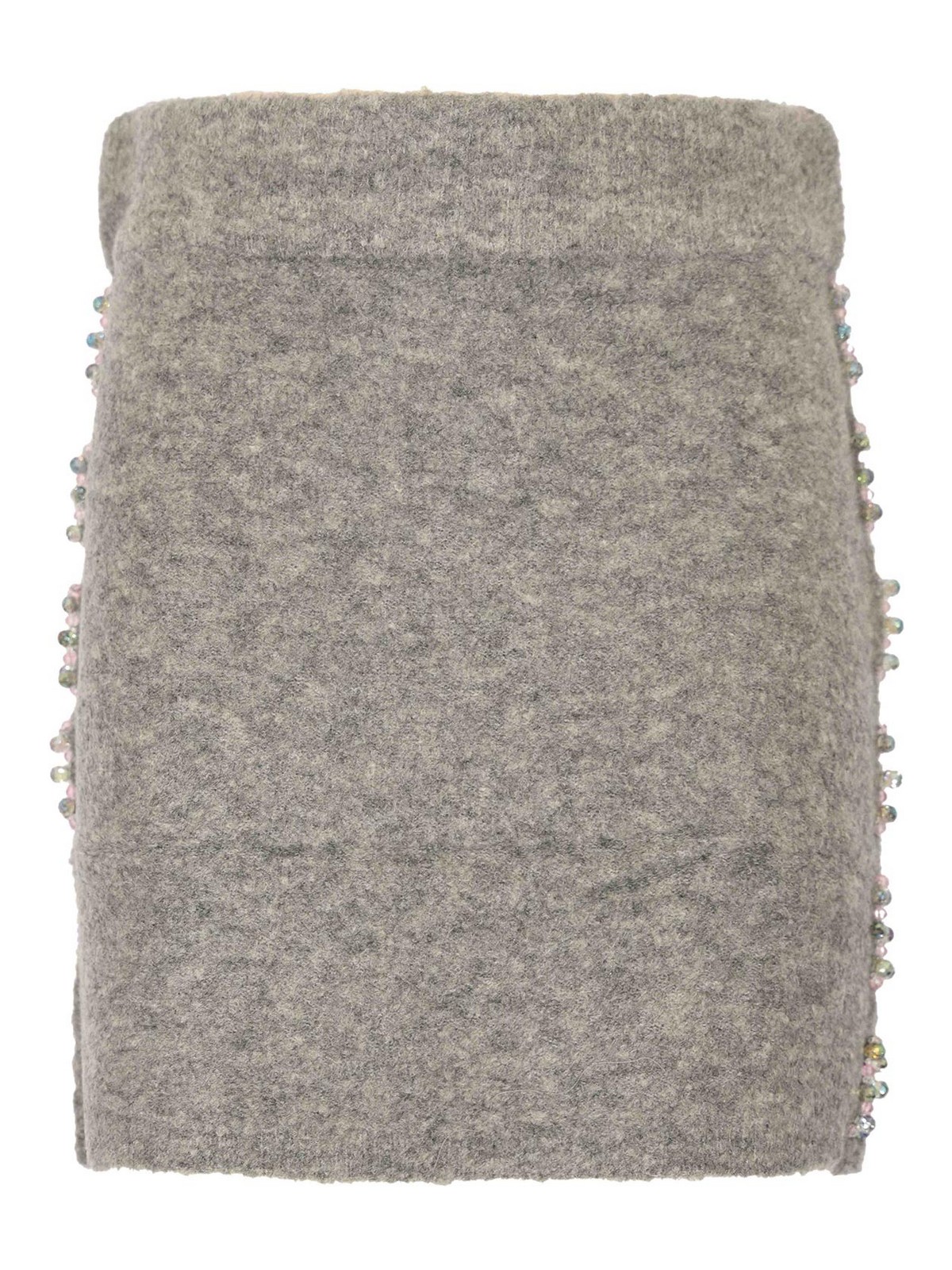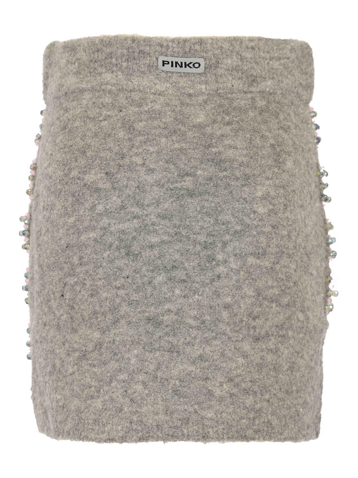 Knit miniskirt with jewel embroidery, pinko, believe model fabric: wool and nylon blend knit pattern: solid gray melange rise: mid-rise, with elastic waistband closure: slip-on closure pockets: none length: short details: clean finish, side trim decorated with multicolor jewel embroidery, pinko logo label on the back lined: no fit: fitted