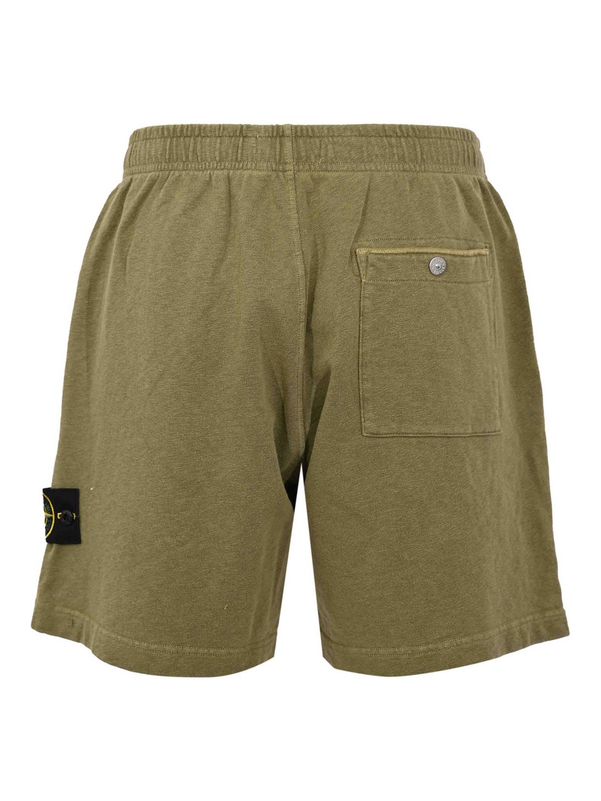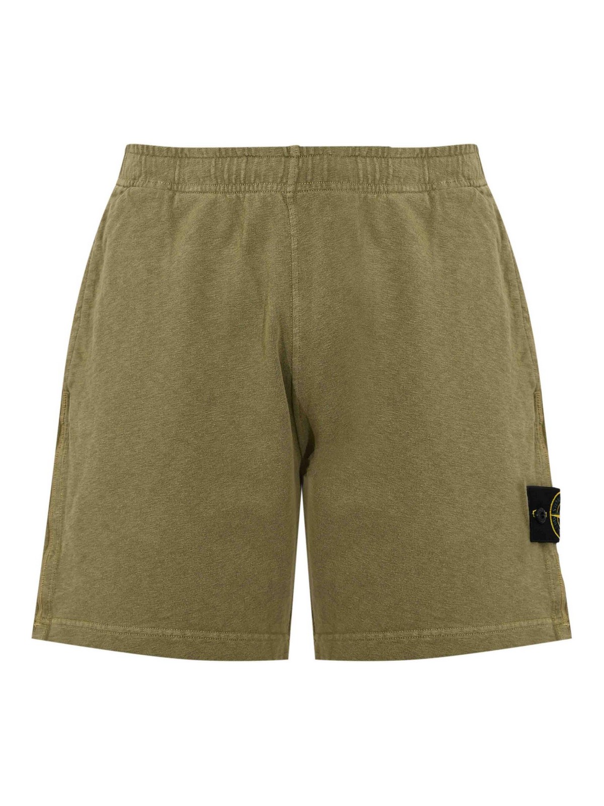 Men's shorts in mafil cotton fleece, stone island, model , fabric: mafil cotton fleece, pattern: solid colour, waist: medium with elastic, closure: absent, pockets: side welt pockets and one applied on the back with automatic button, length: knee-length, details: stone island logo patch applied on the leg with button, visible stitching, lined: no, fit: regular