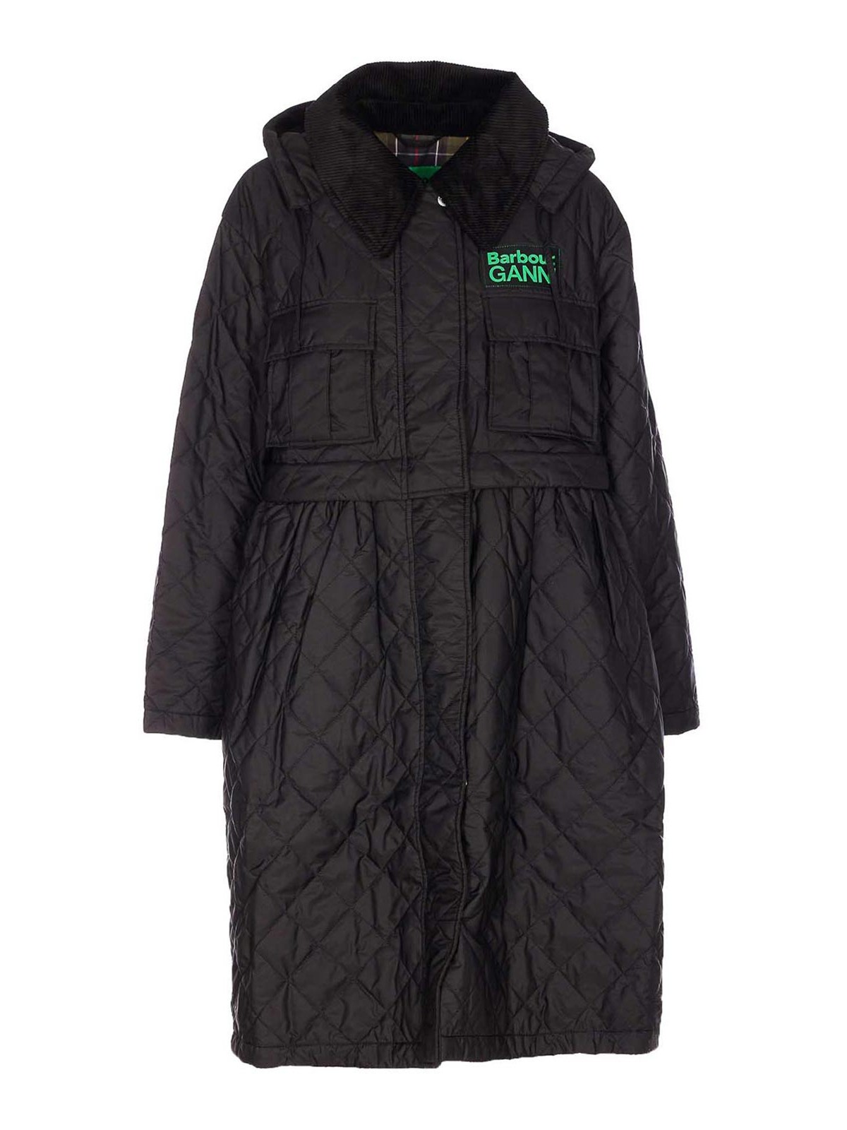 Barbour x ganni black quilted down jacket with frontal zip closure, zip and buttons closure, collar, removable hood detail, quilted, removable detail at bottom, patch logo on the front