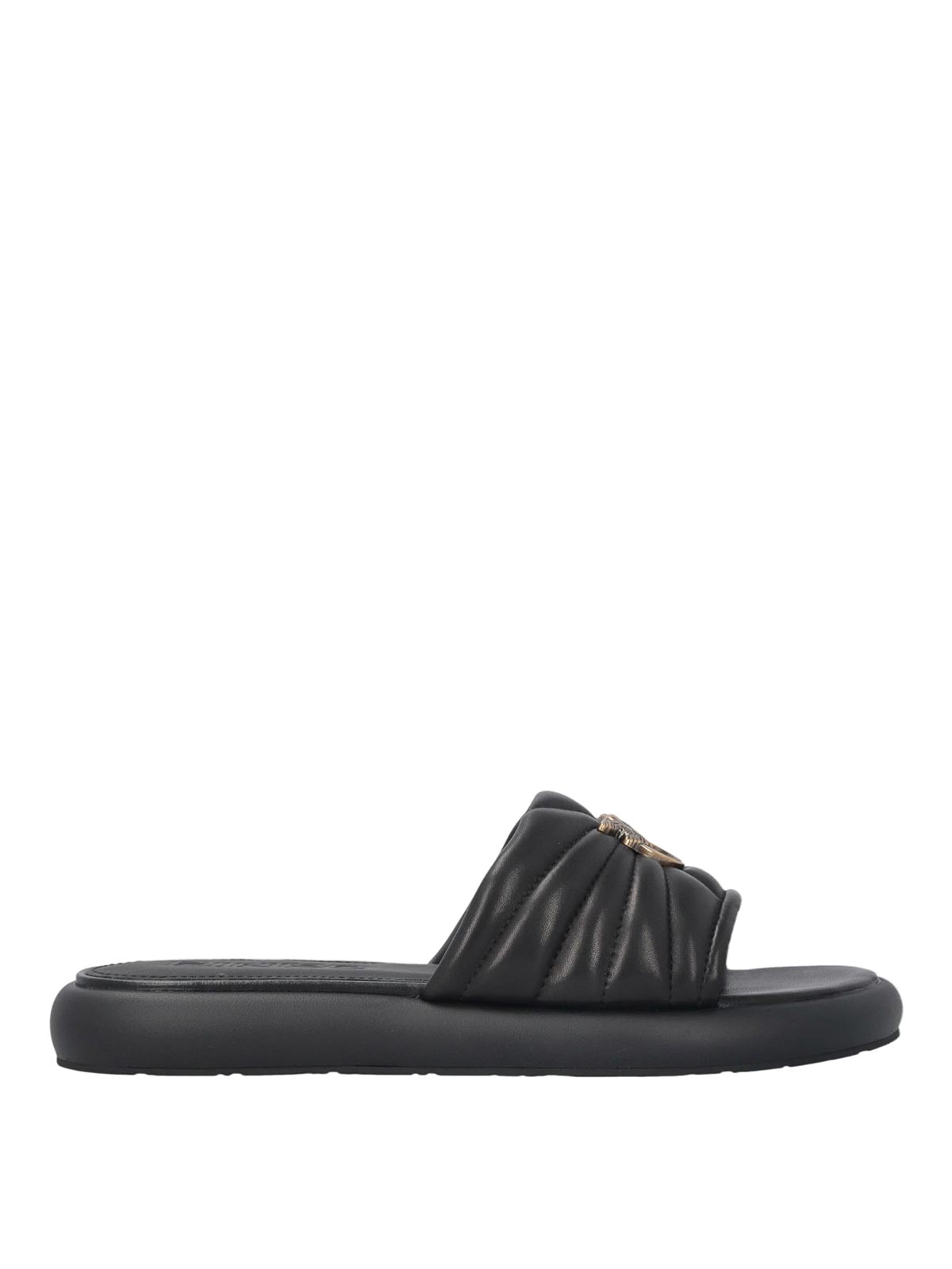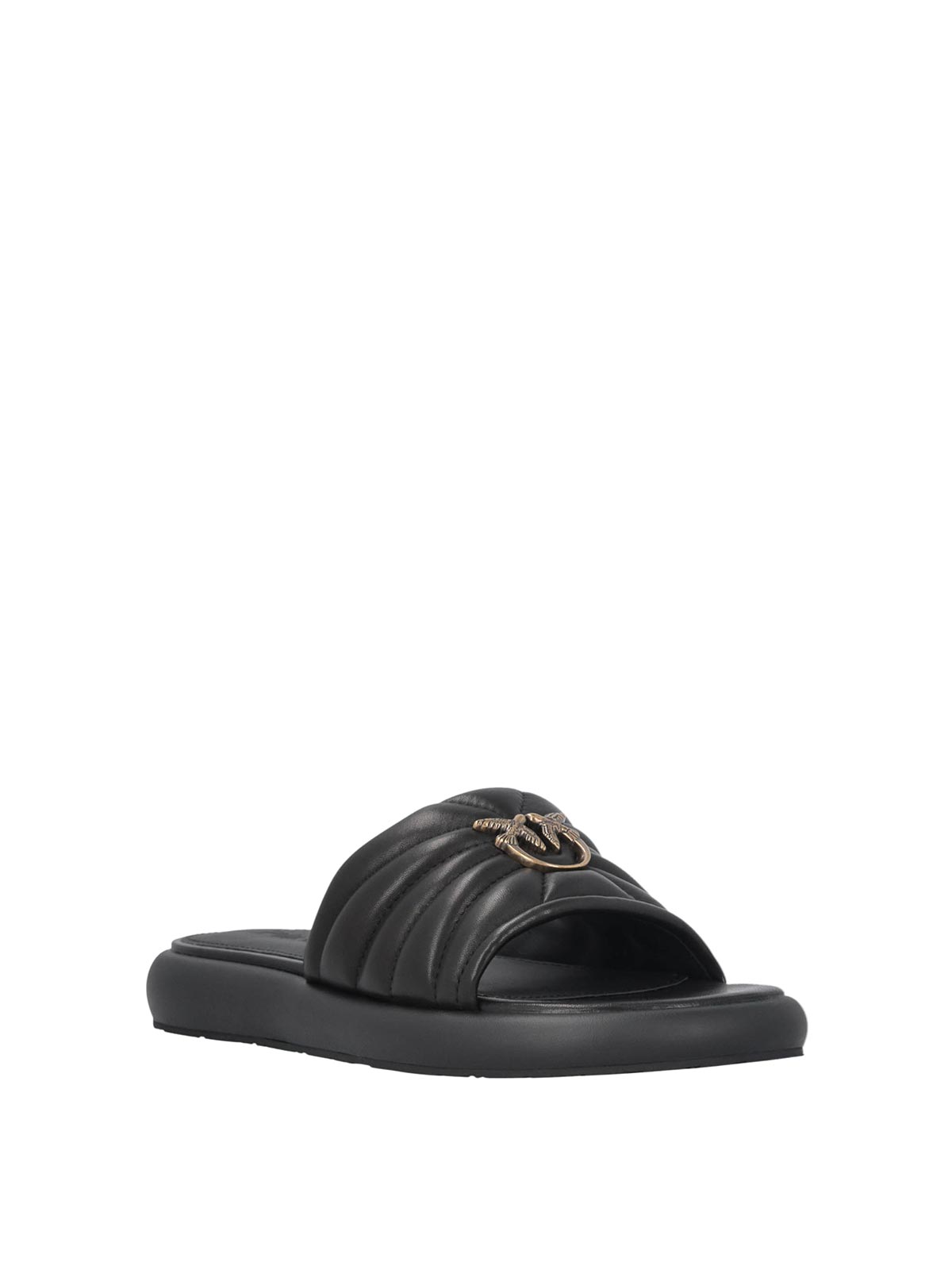 Pinko fiona 03 nappa slippers - black, slippers with a contemporary design made of nappa with padded band and relief quilted workmanship. the soft construction enhances the volume of the upper, ensuring comfort and lightness in the fit. the front metal logo with antique finish signs the model with an iconic detail. the flat sole with a clean line completes the design with an essential and modern aesthetic. upper in nappa padded band with quilted work front metal logo flat structure soft and contemporary line, upper composition: 100% sheepskin (ovis aries)