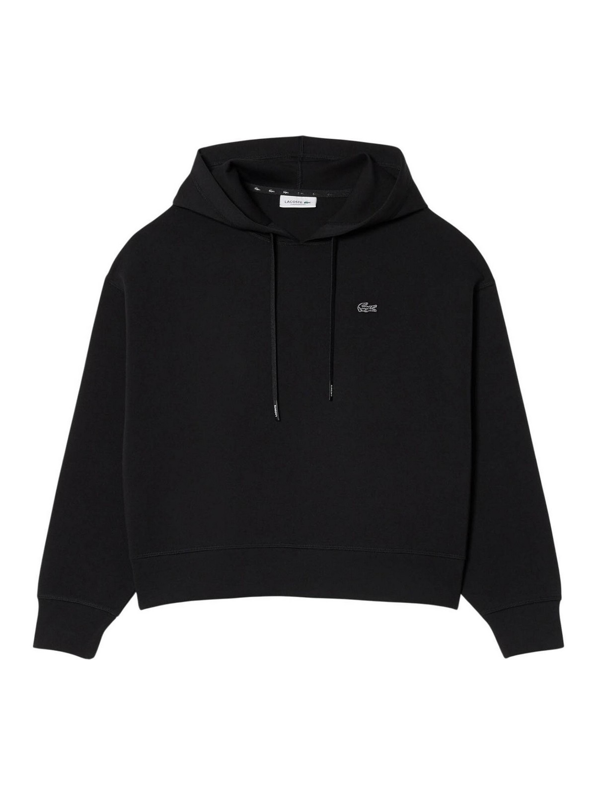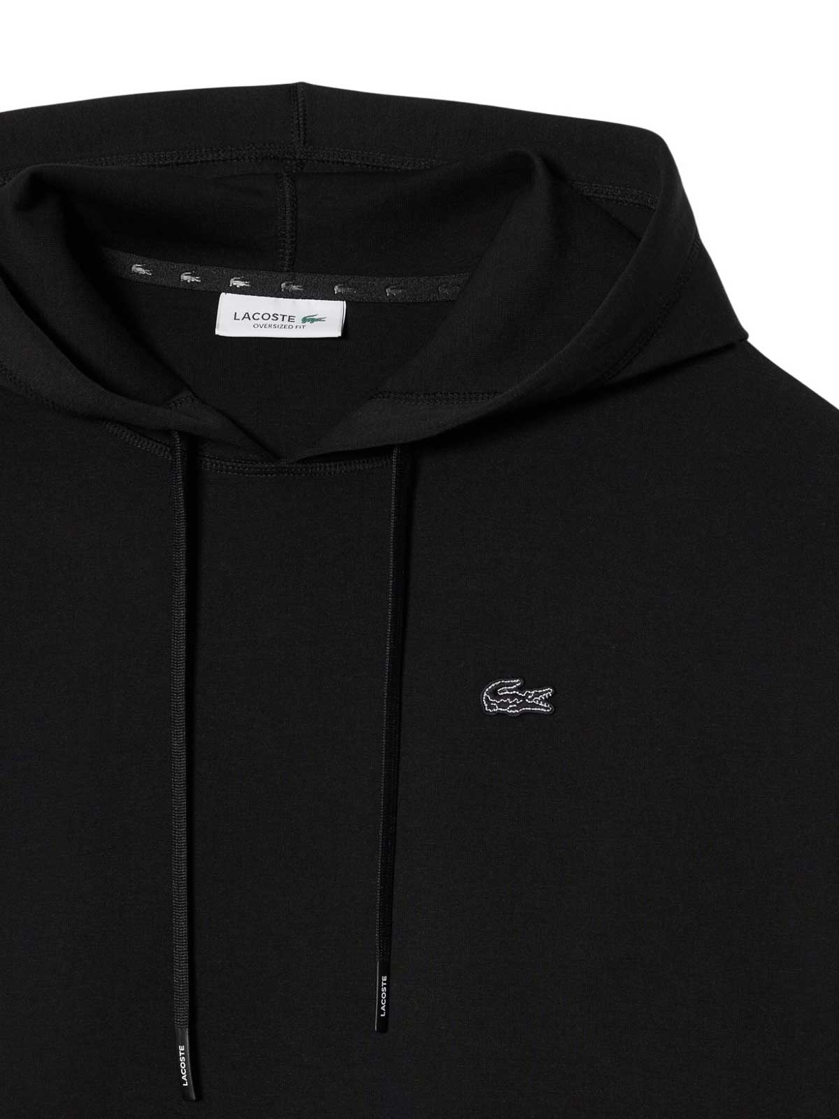 Lacoste, oversized sweatshirt with adjustable hood, black, this Lacoste hoodie combines contemporary elegance and sportswear DNA in a garment with an essential and refined design. made of double-face jersey, it offers a feeling of high comfort and a clean structure, enhanced by thin stitching that defines the construction details. the loose cut with dropped shoulders gives a modern silhouette, while the adjustable hood completes the model with functionality and style., double-face jersey in organic cotton and recycled polyester, oversized fit with dropped shoulders, soft and generous cut, stitching on the collar, hem, sleeves and cuffs, adjustable hood with drawstring and branded terminals, tone-on-tone crocodile embroidery on the chest.