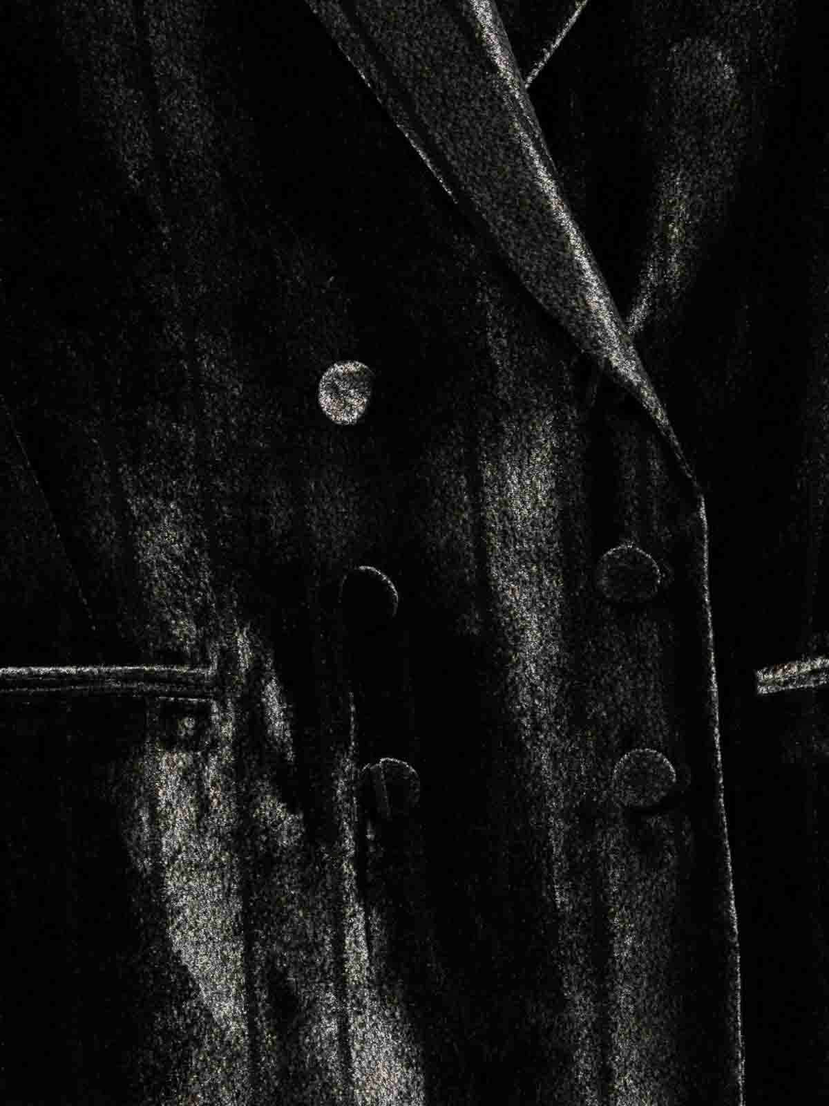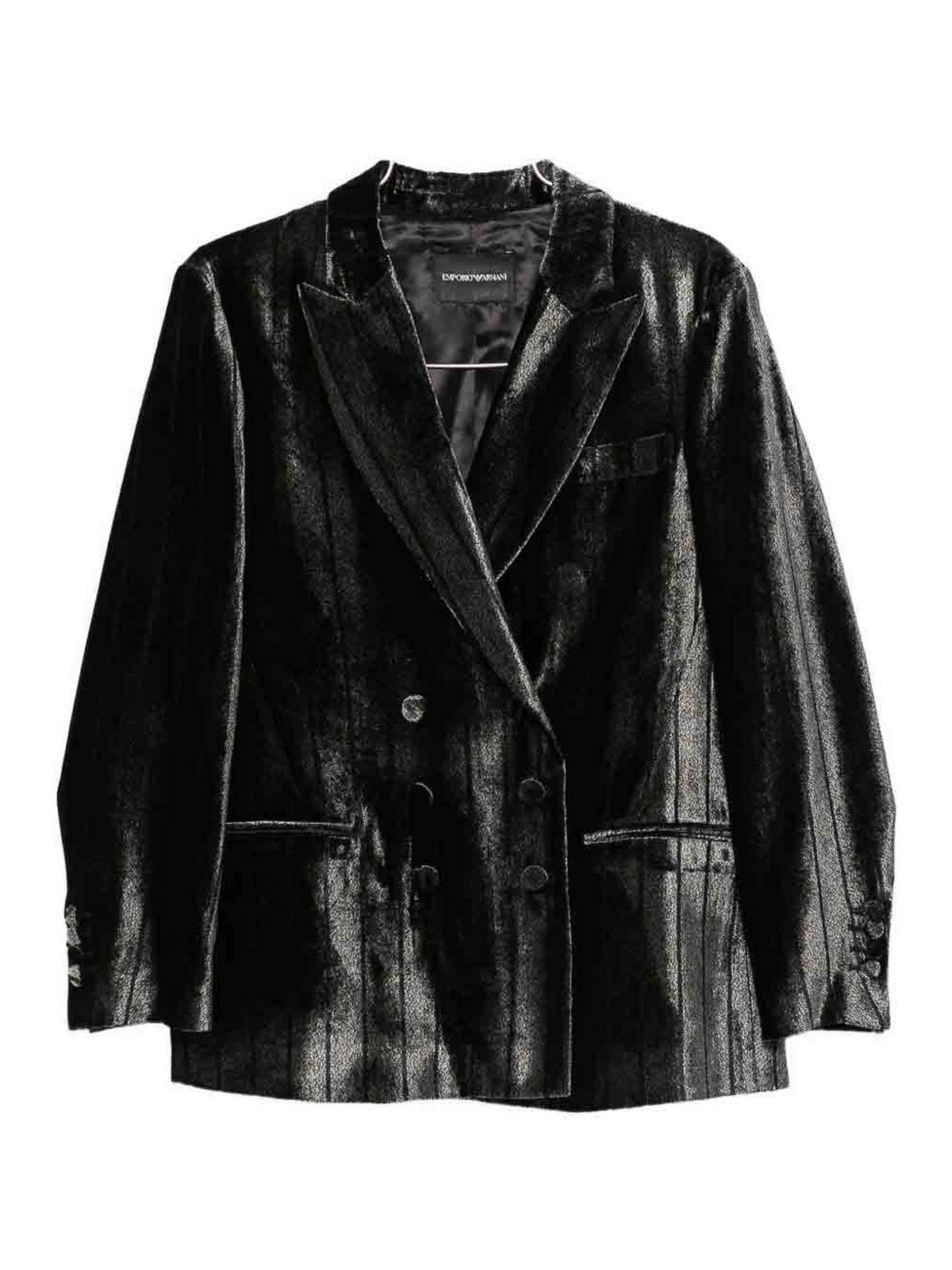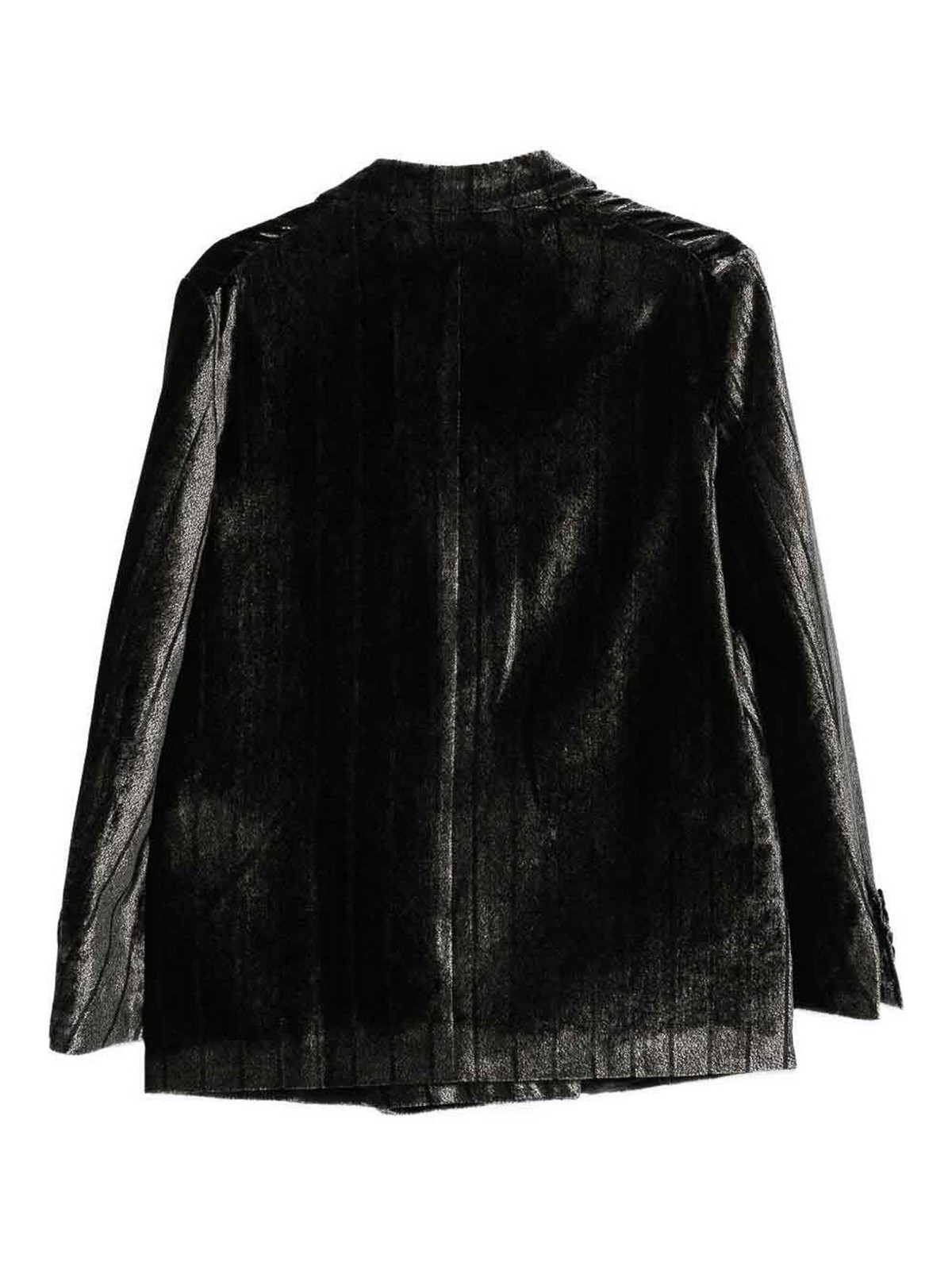 Black pinstripe pattern double-breasted button fastening notched lapels flap pockets