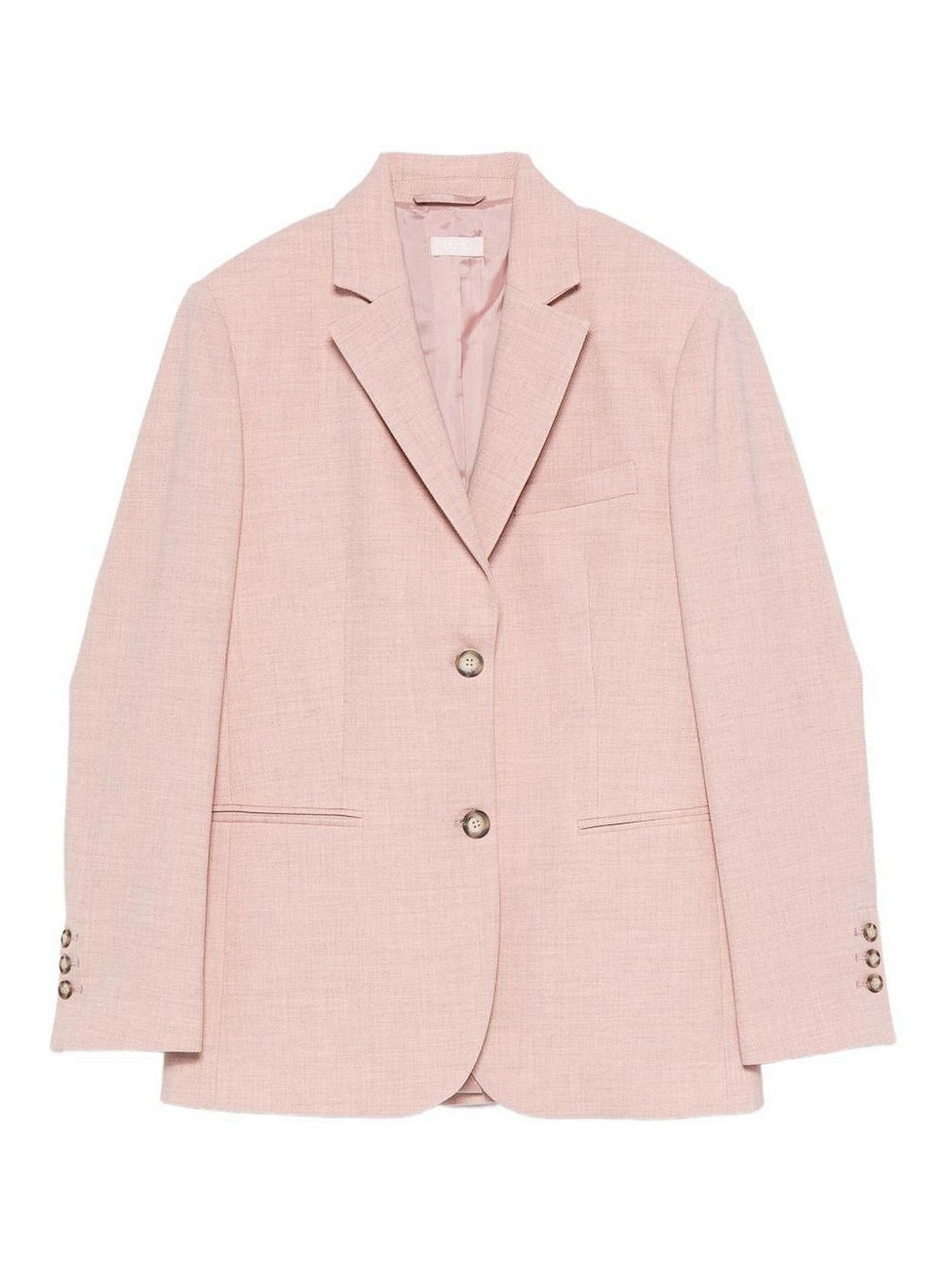 Features light pink button placket, notch lapels, long sleeves, flap pockets, buttoned hems