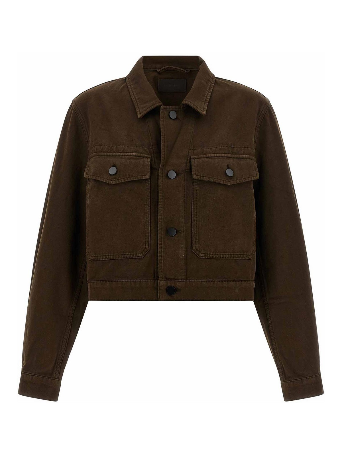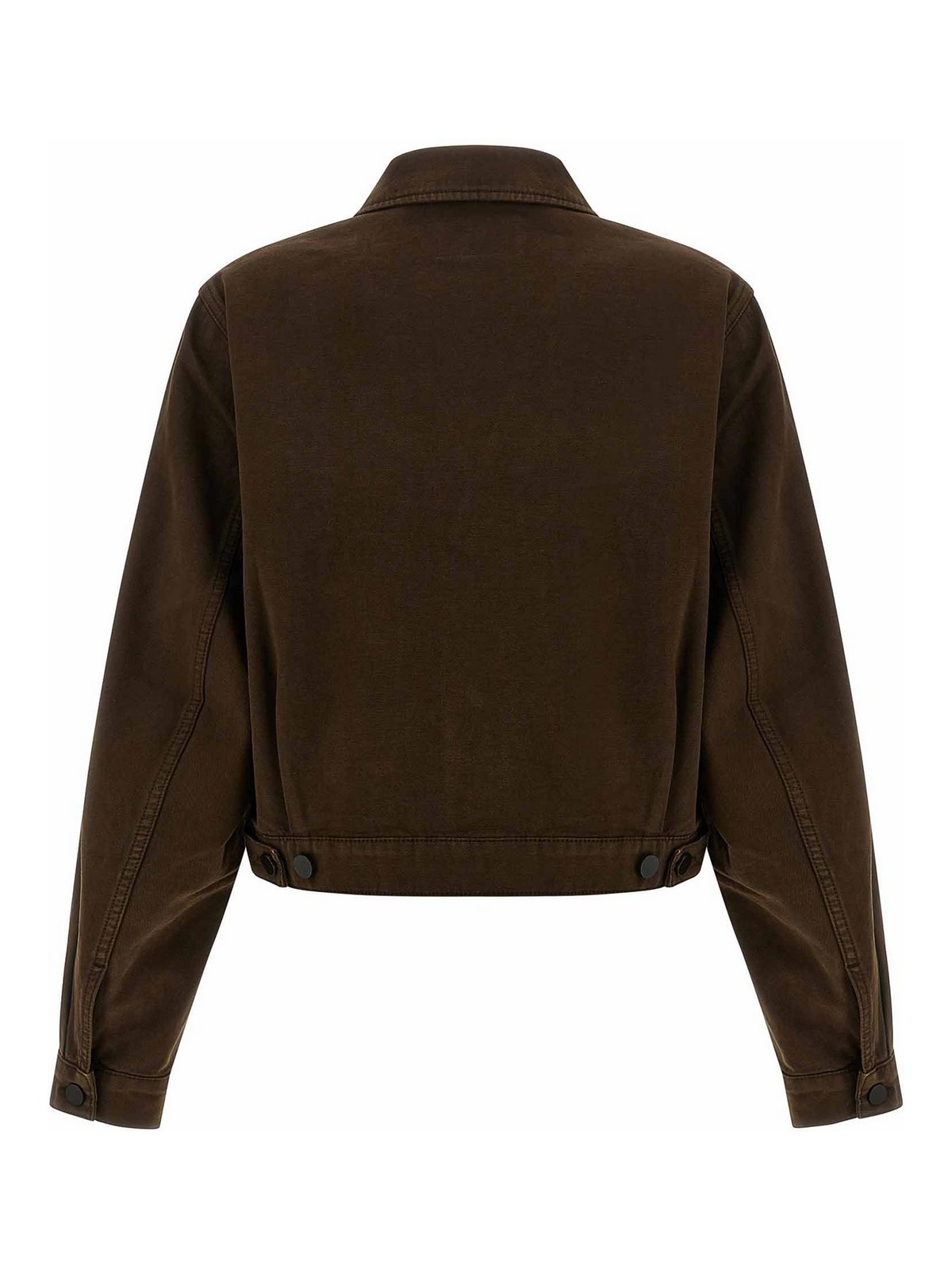 Garment-dyed broken twill blouson, crop model, shirt collar, front button closure, pockets, long wide sleeves with cuffs, unlined.