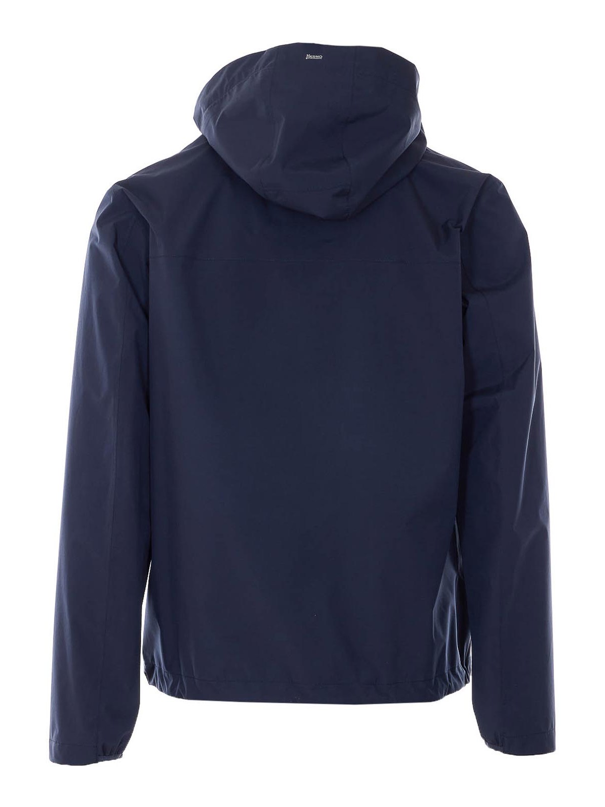 Herno blue jacket with frontal zip closure, removable hood detail, lateral zip pockets